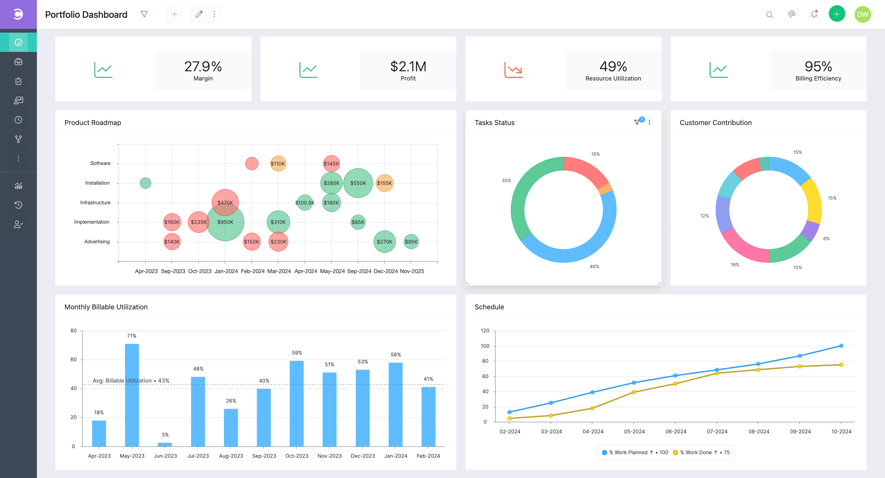 Get aggregated information about your projects with our fully customizable portfolio dashboards. Customize and track important portfolio KPIs with ease.