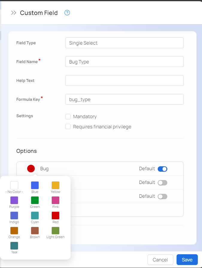 To define colors for a single-select field, define a color for each option. To define colors for a formula field, define a color for each possible output. To see the allowed values, click on the icon.