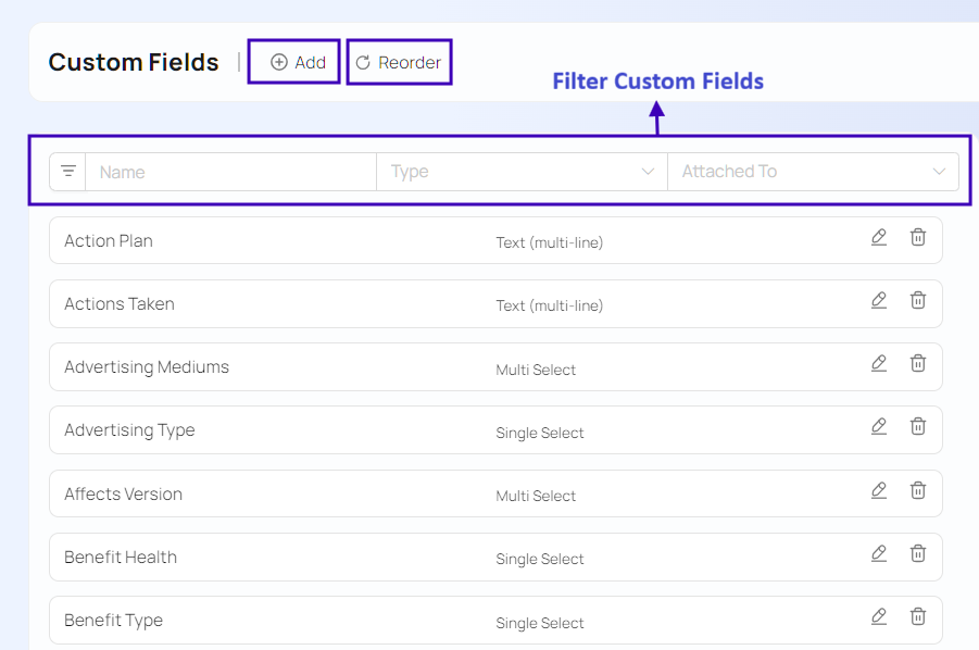 You can control the order of custom fields in forms and overview screens. To reorder, open the custom fields screen as indicated above and click on the Reorder button. You can reorder the fields using -drag-n-drop.