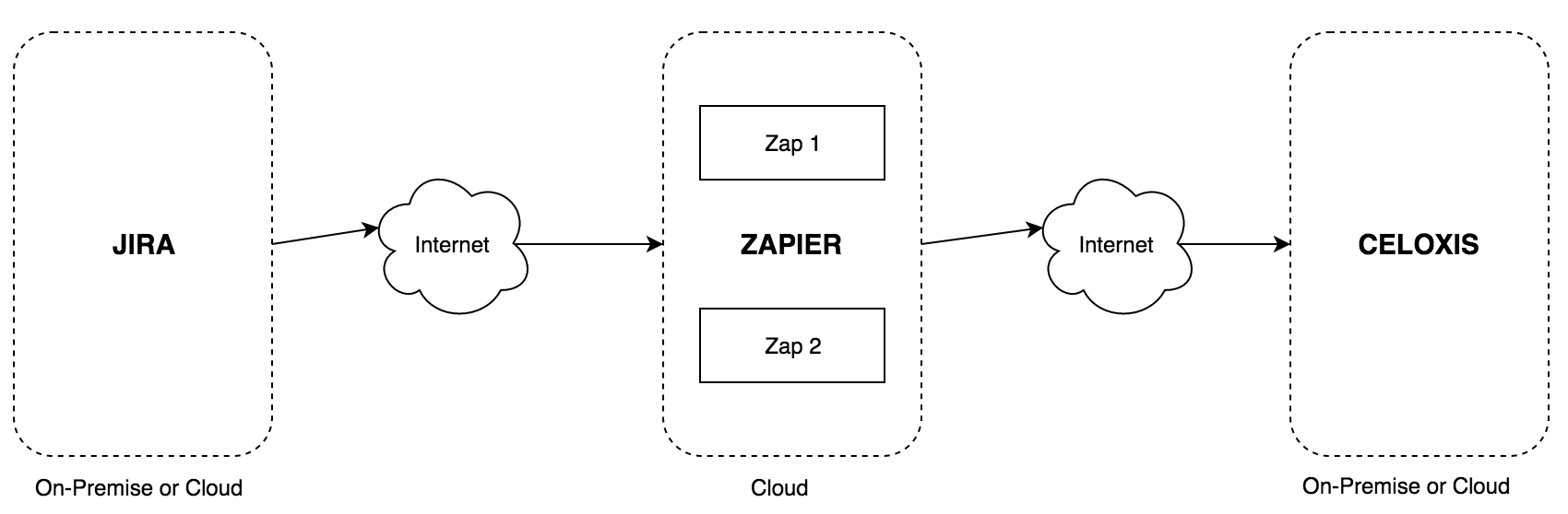 From the above diagram, you can see that Jira and Celoxis can even be on our intranet provided they have access from the internet. It may be possible to configure internet access only from Zapier.