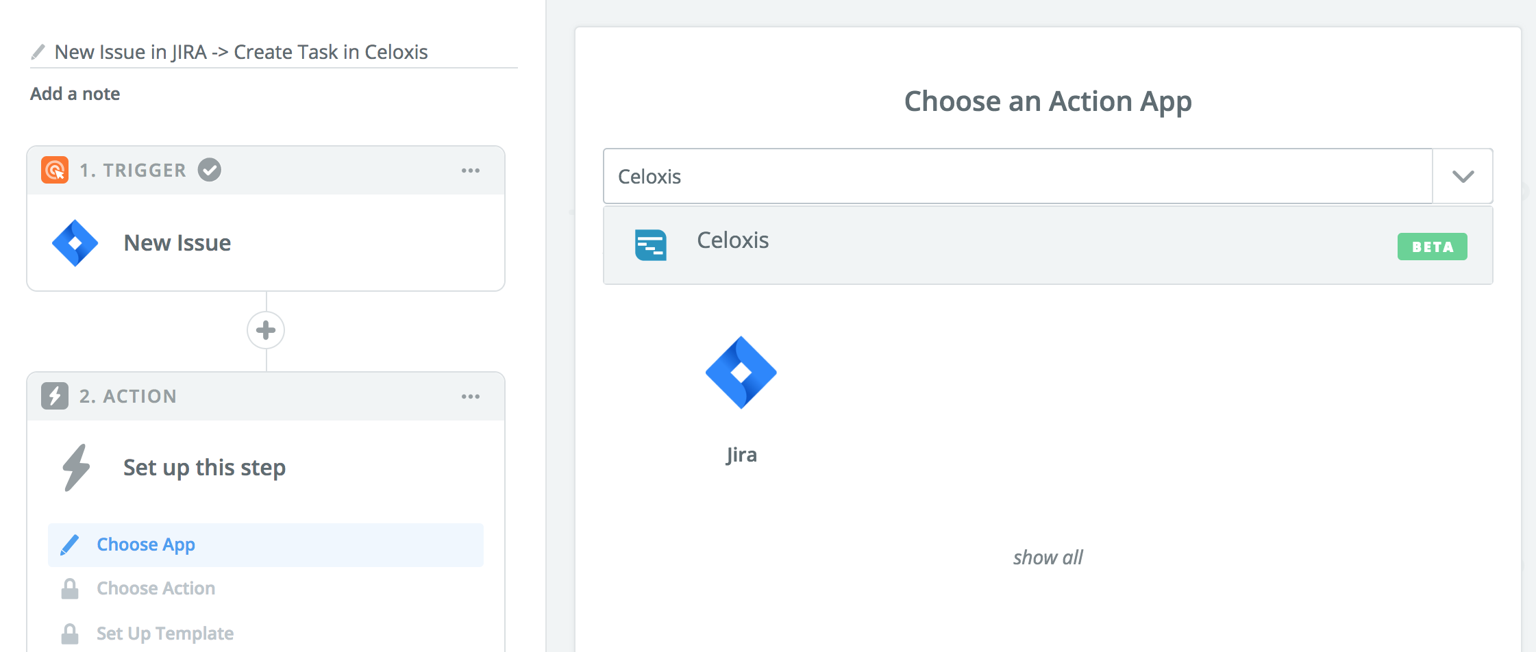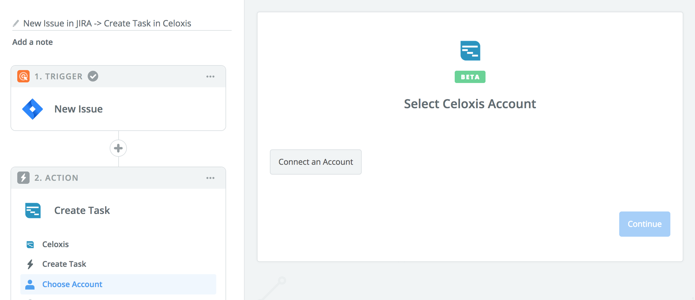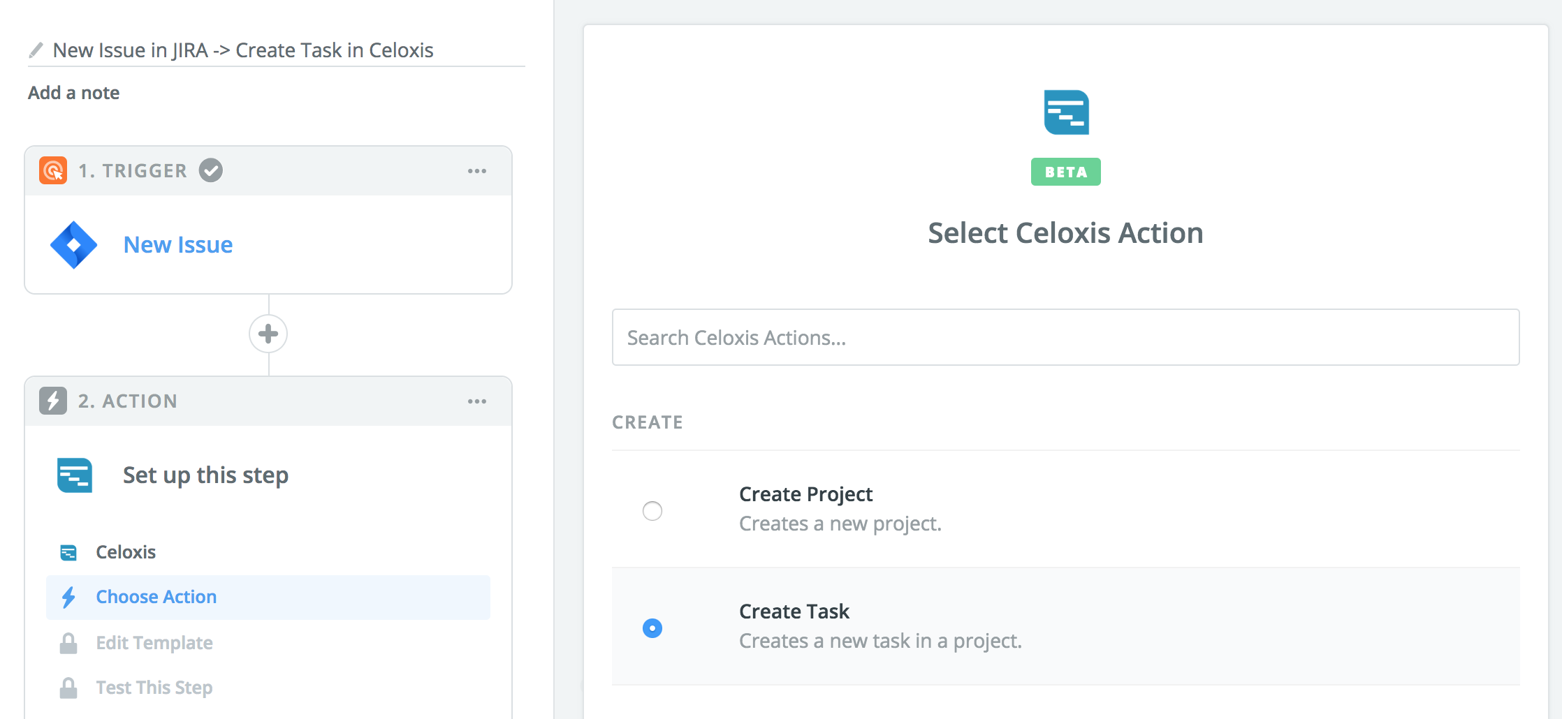 - Zap #1 — when an issue is created in Jira, create a task in Celoxis.