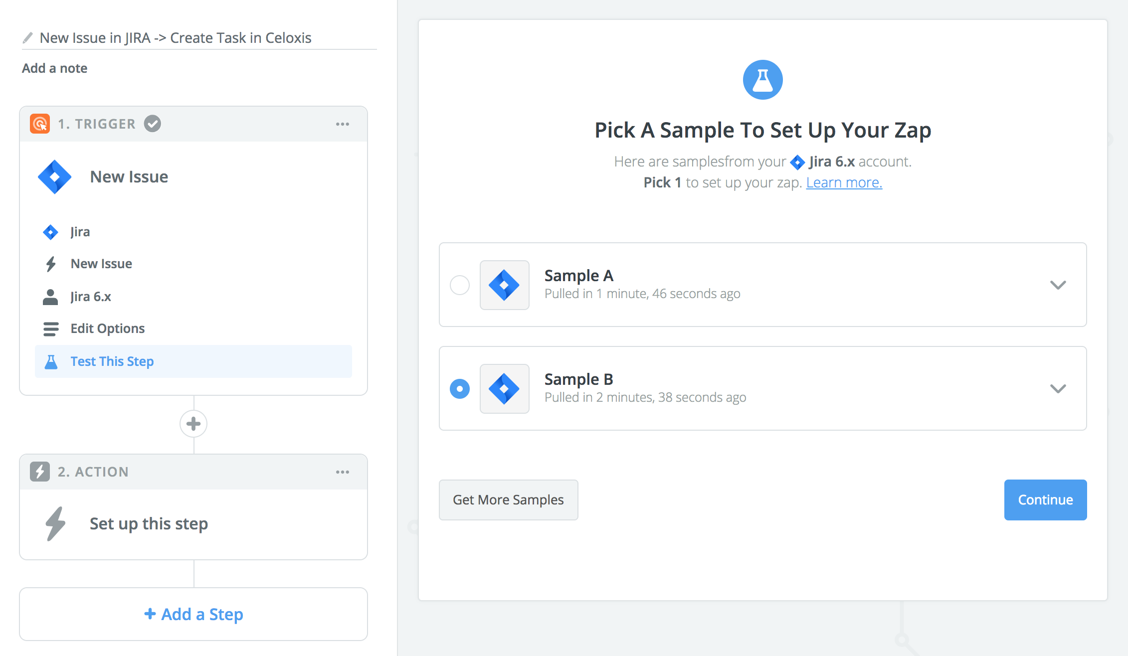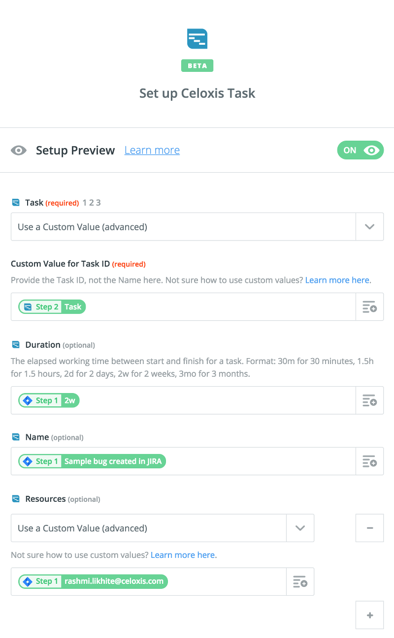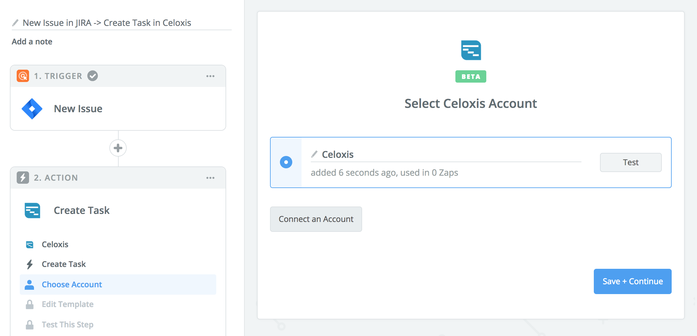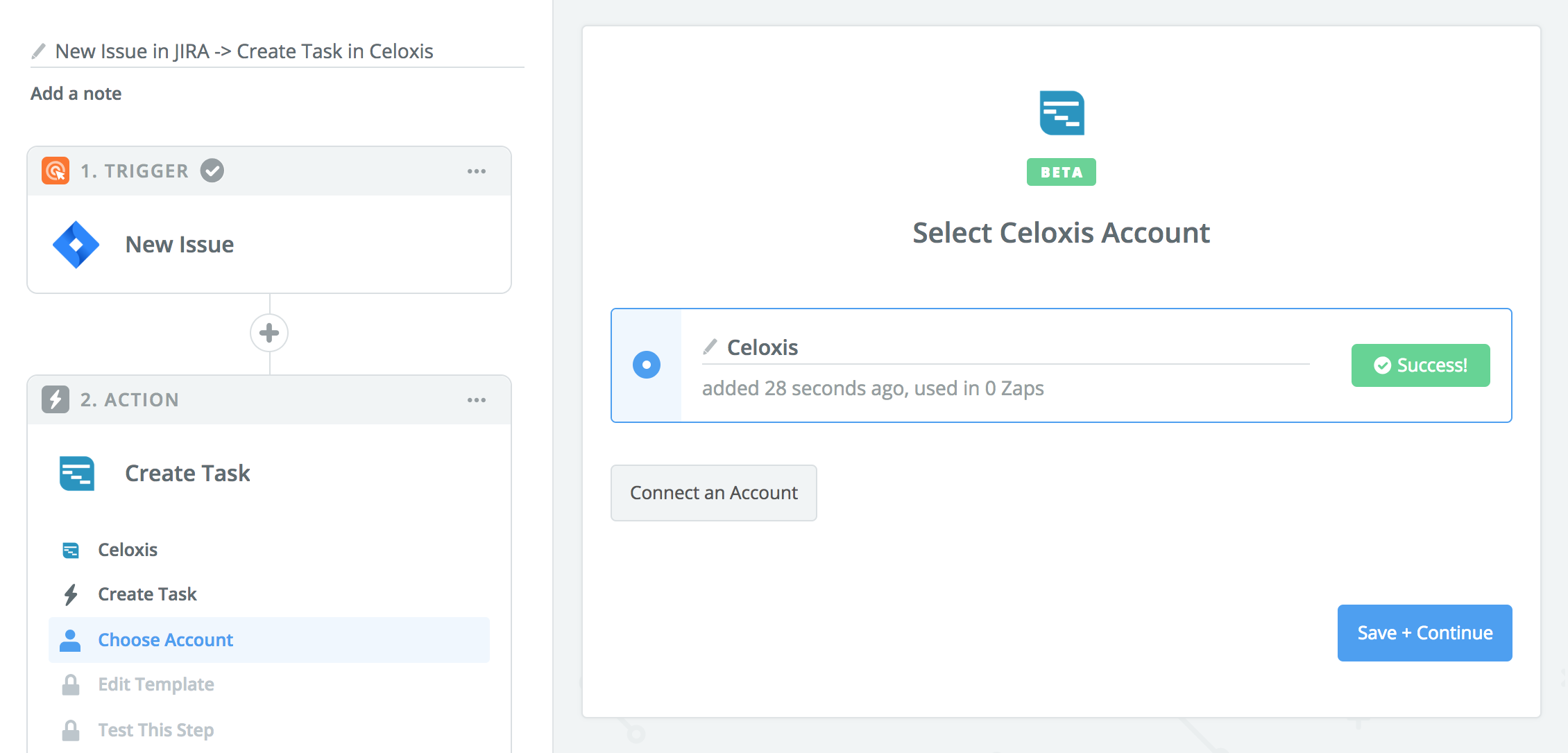 - Zap #1 — when an issue is created in Jira, create a task in Celoxis.
