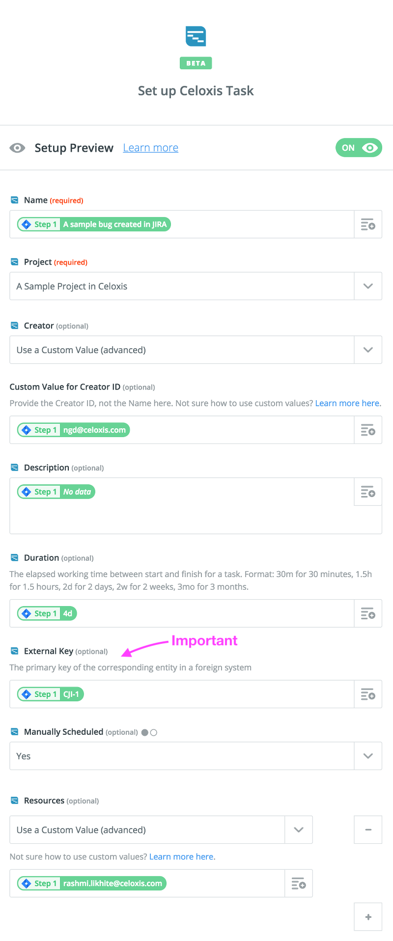 Note how the task field is mapped to use the task found out in the previous step. Rest of the fields are used as a sample.