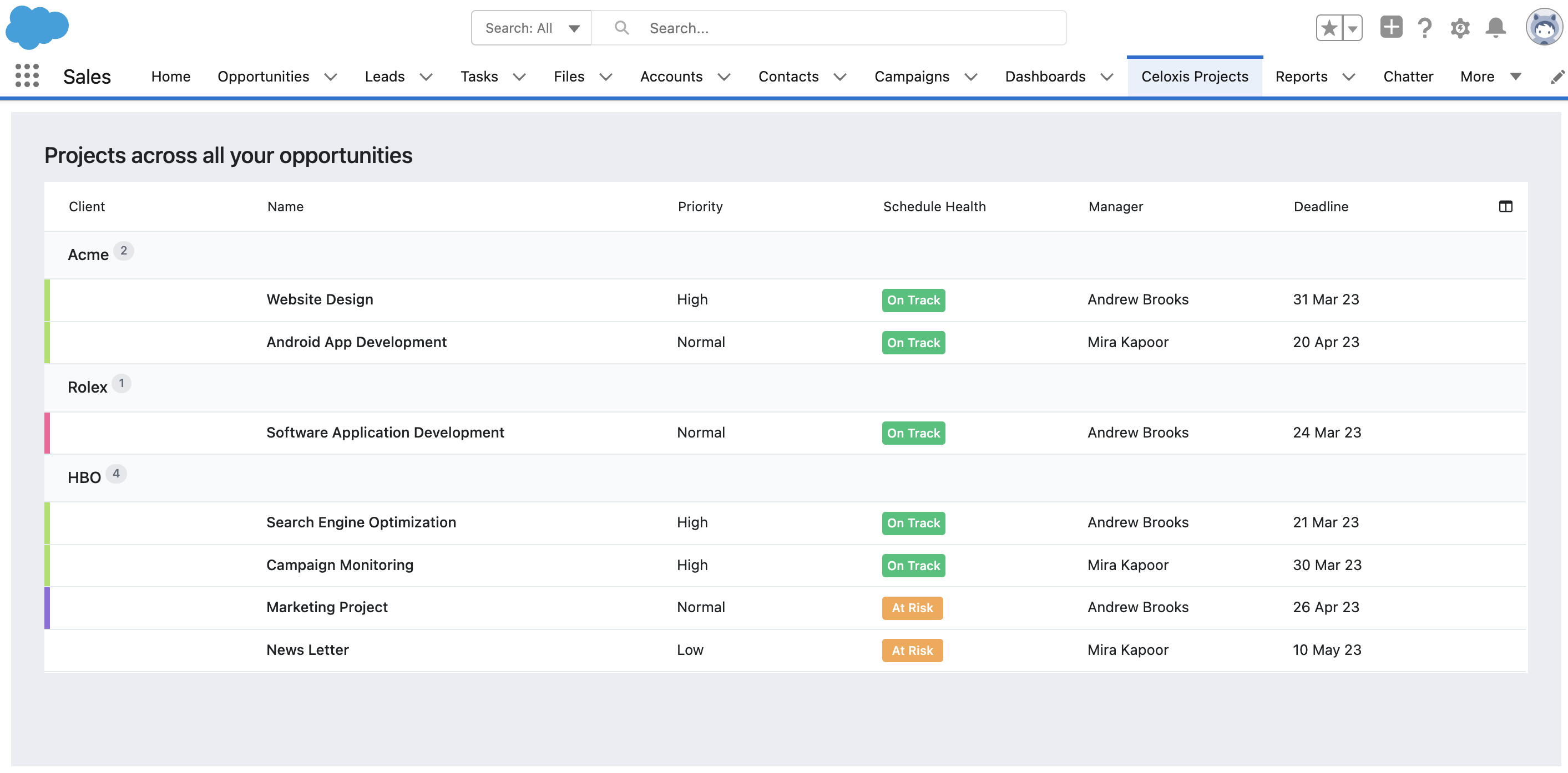 This integration allows sales representatives to create multiple Celoxis projects per Salesforce.com opportunity. In addition, there is a ‘Celoxis Projects’ Tab, which lists all Celoxis projects created across all opportunities for quick and aggregate viewing at the account/client level.