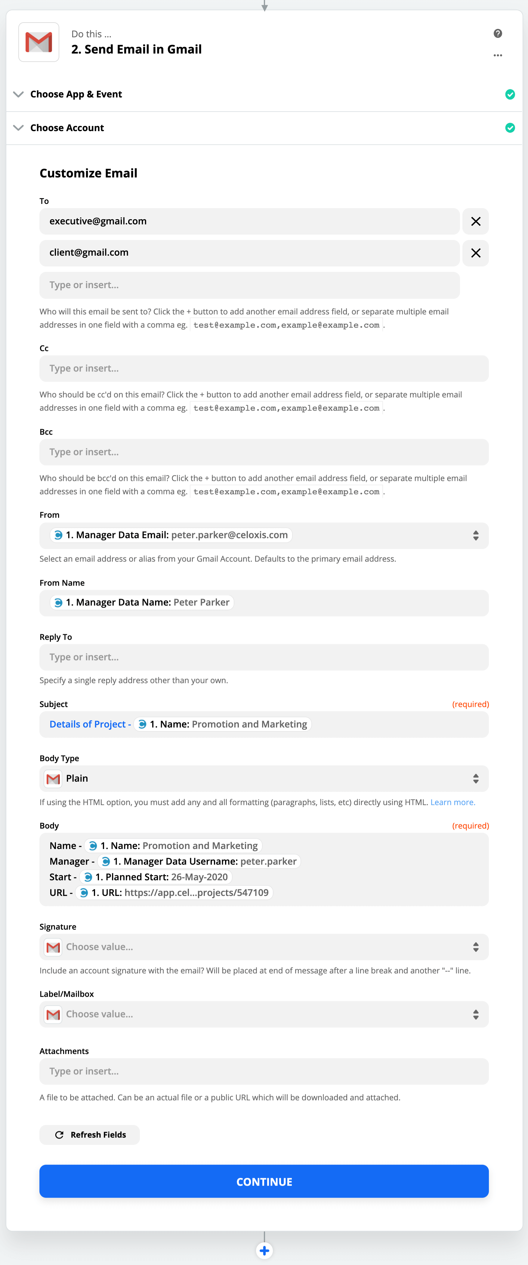 In this article, we will learn to send a customised email whenever a New Project is created in Celoxis. For this we will be using Zapier, if you are not familiar with Zapier then first read this article.