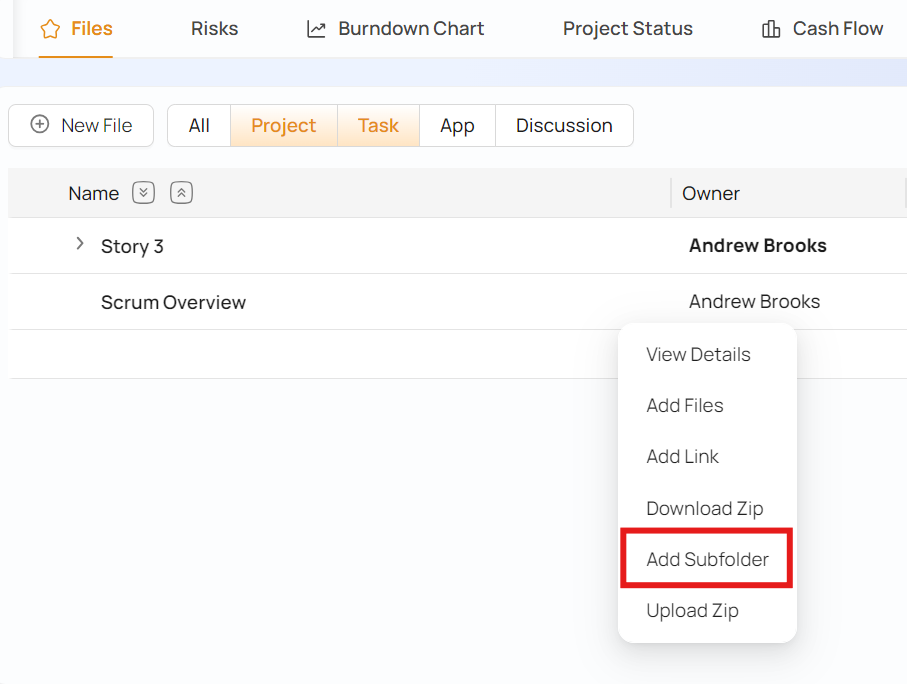 To add a sub-folder, click on a project to open its panel and then click on the Files tab. From the menu besides the project name folder, click on Add Subfolder as shown above.