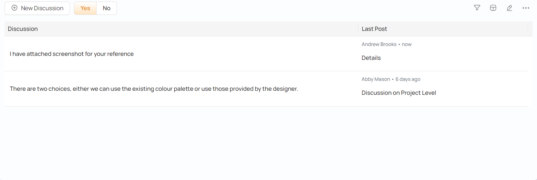 You and your team can conduct discussions in a project. You can also decide to involve the project clients in the discussion. An example where a team discusses the about a design is shown below.