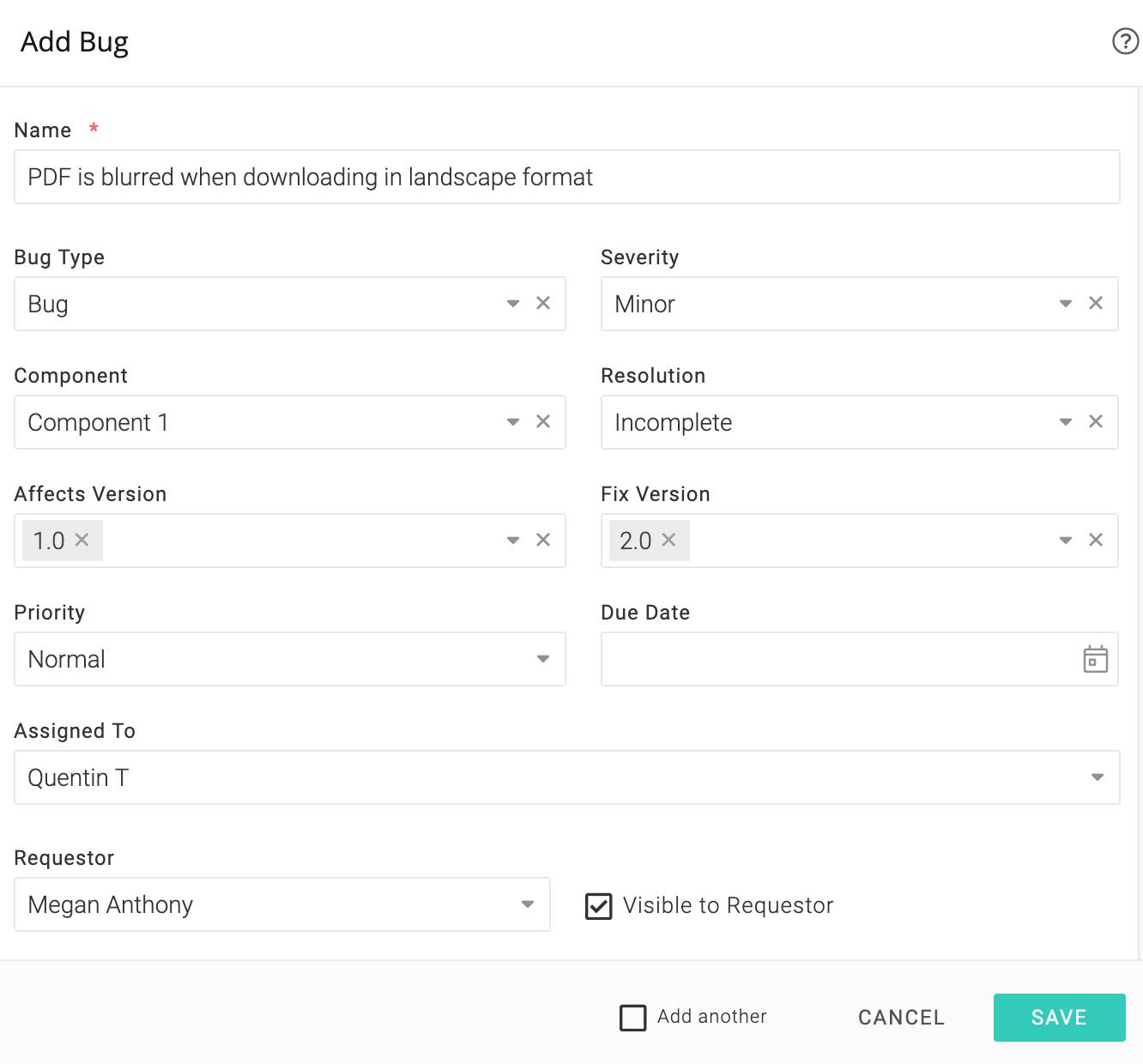 Megan wants to report a bug. She clicks on Top Menu ▸ ▸ and she sees the form: