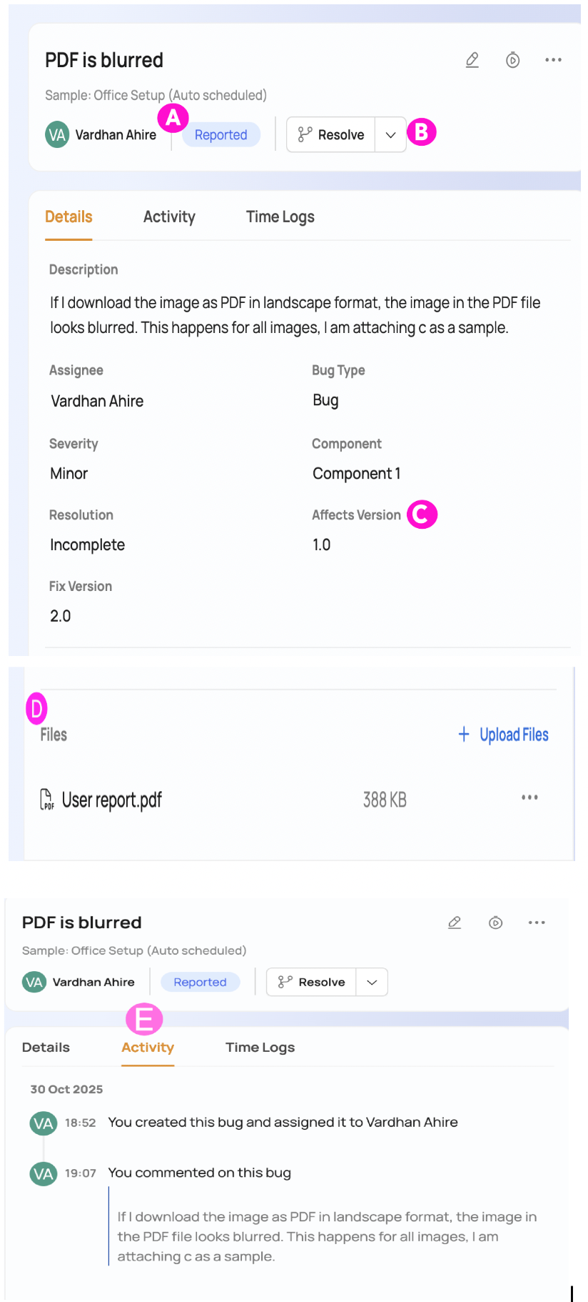 | E | He can look at the history of the bug and also add his comments. |