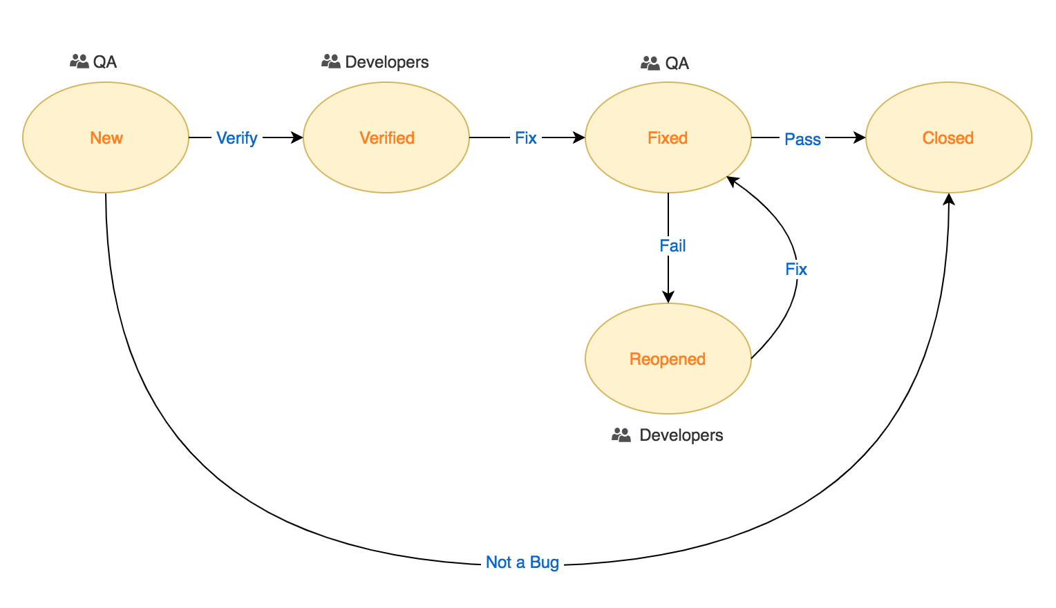 - The fix is then tested by QA and the bug moves to Reopened, if test fails; or Closed, if the test passes.