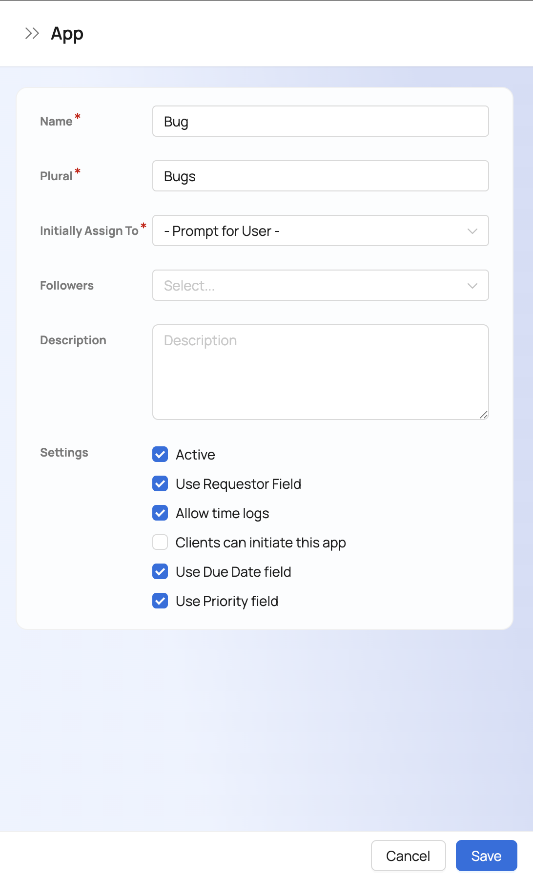 | Followers | Select the default followers. Followers will receive notifications when there is reassignment, state change or new comments. |