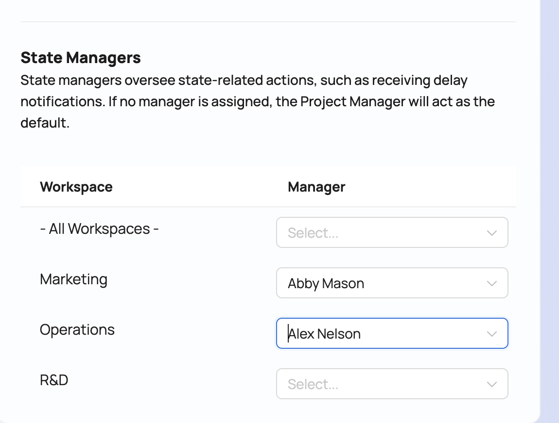 A state managers is a user who is treated as a Manager when an app is in a particular state. They are notified when things happen to an item in this state. In our example below, Mark is the QA manager, so he is responsible for the New and Fixed states where the QA team is supposed to do work.