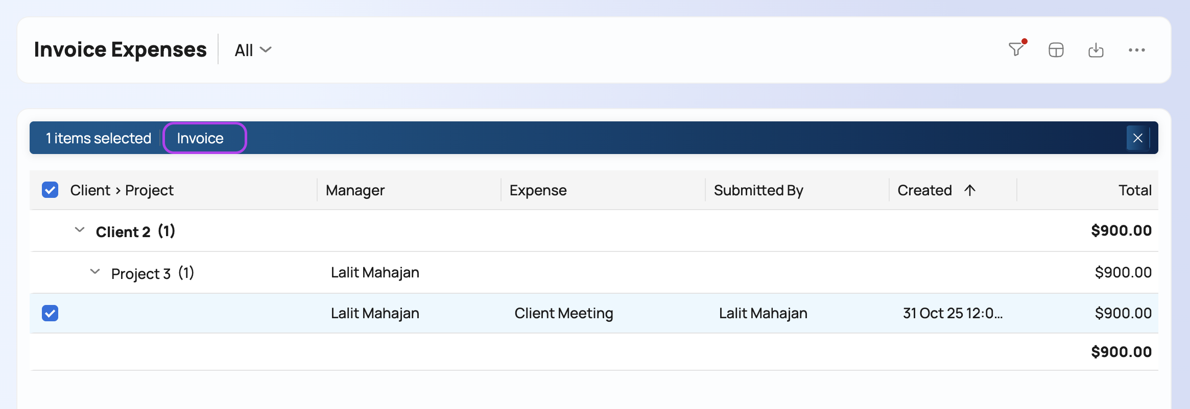 By marking expenses as invoiced, you are indicating that the client has been sent an official invoice from your company. You will need the Time & Expense > Invoice : Granted privilege to invoice expenses. To invoice expenses, click ▸ ▸ . This will show a list of all billable expenses that have been approved but not invoiced.