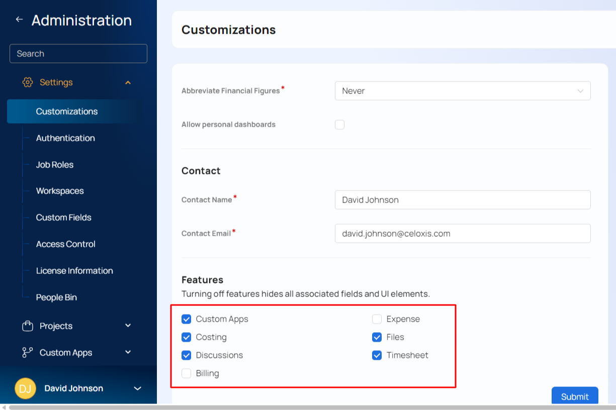 When you turn off features that you do not plan on using, related buttons and menus are not shown to users in your account making the user interface easier to use. To do this go to Top Menu ▸ ▸ Admin. Then, switch the features on or off as shown below. In the following image, Expenses and Contacts functionality has been turned off.