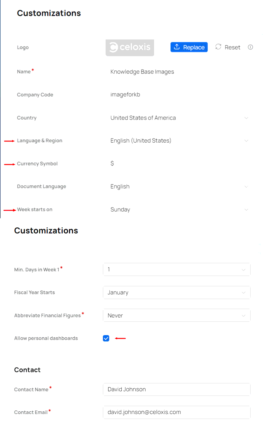 A number of organization widget settings are used while display various user interface widgets like calendars or while displaying reports. Configure the options highlighted in the image below by navigating to Top Menu ▸ ▸ Admin ▸ ▸