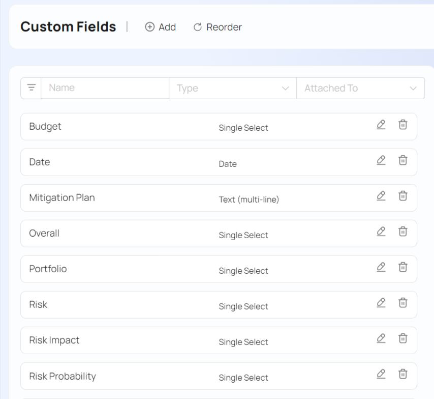 You can attach the same custom field to multiple types. For example, the following custom fields is available for all project types, the "Project Request" custom app and tasks. To change, click on the icon in the list as shown above.