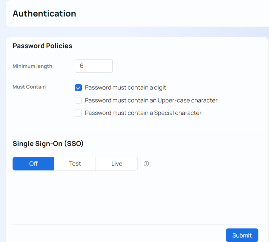You can configure login settings by navigating to Top Menu ▸ ▸ Admin ▸ ▸ and then clicking on the tab.