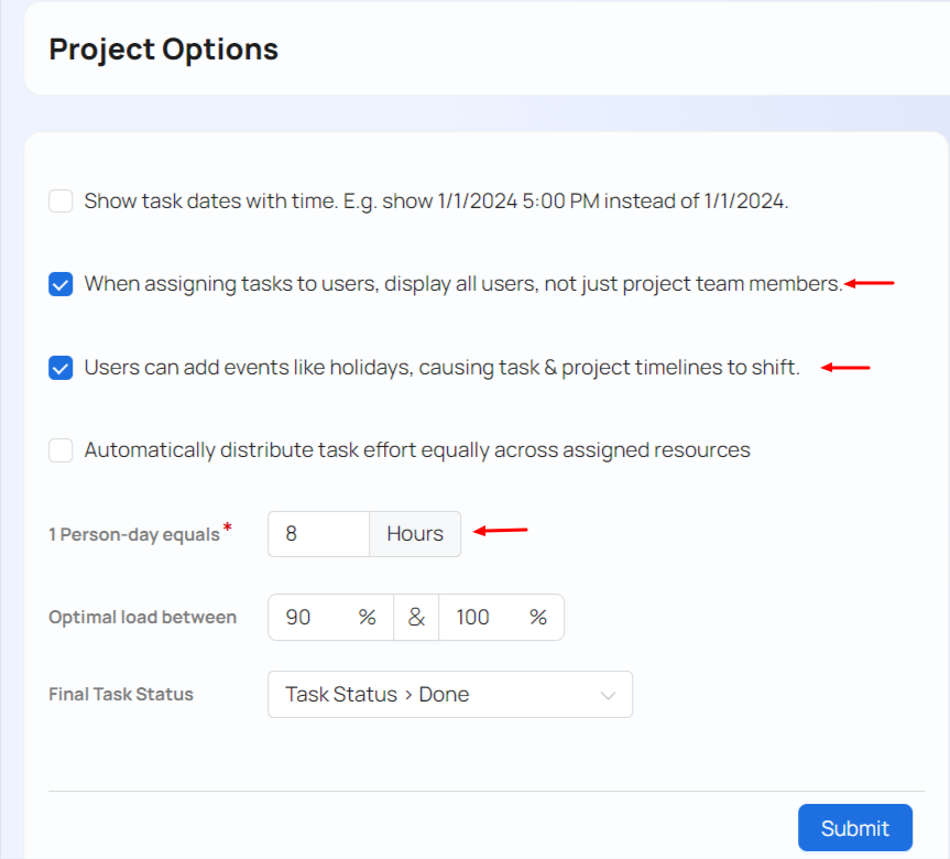 The software has the capability to automatically schedule tasks based on the assignee's work timings and holidays in addition to other parameters like dependencies, constraints, etc. So it is important to set the working timings correctly.