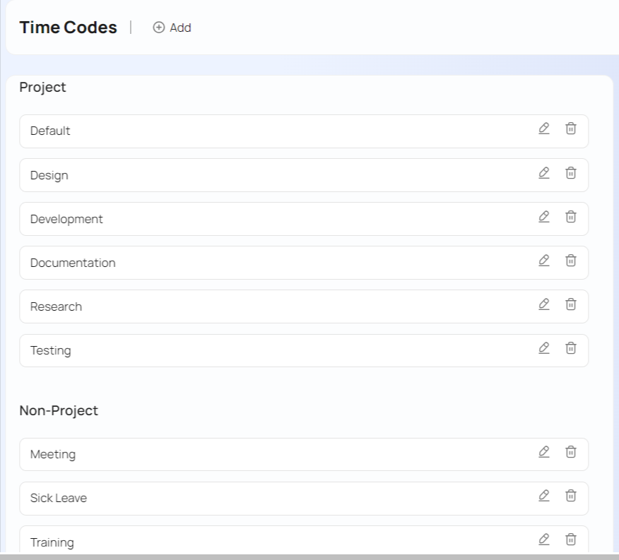 If you do activity based billing, or if you want to categorize time logs, you should customize this list by going to Top Menu ▸ ▸ Admin ▸ Timesheet ▸ Time Codes.