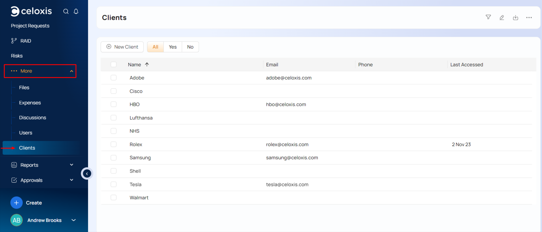 Projects can be associated with clients. You can, optionally, give clients a login and a dashboard so they can access project status and collaborate with your team through the software. To view or add clients, go to ▸ More ▸ .