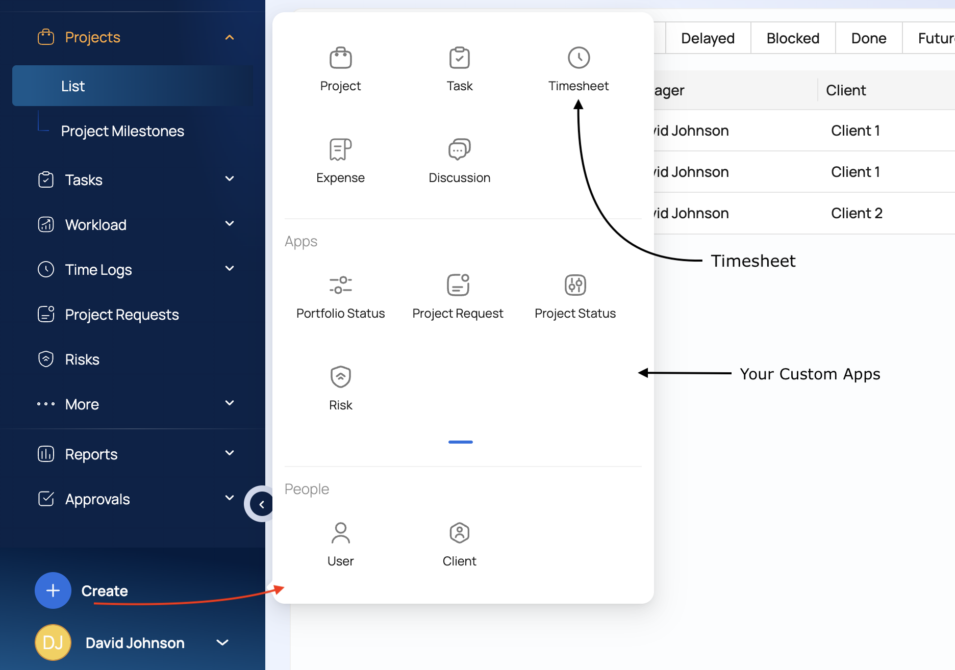 The add button is always available on all pages and can be used to add projects, tasks, issues, risks, users and more as show below. You can quickly jump to the timesheet by clicking on the timesheet icon.
