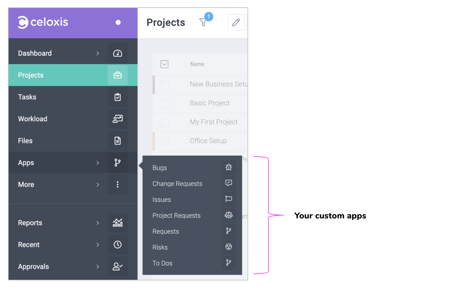 The Apps menu is the way to go to lists of your custom apps. In the following example, clicking on Issues will take you to the list of issues.