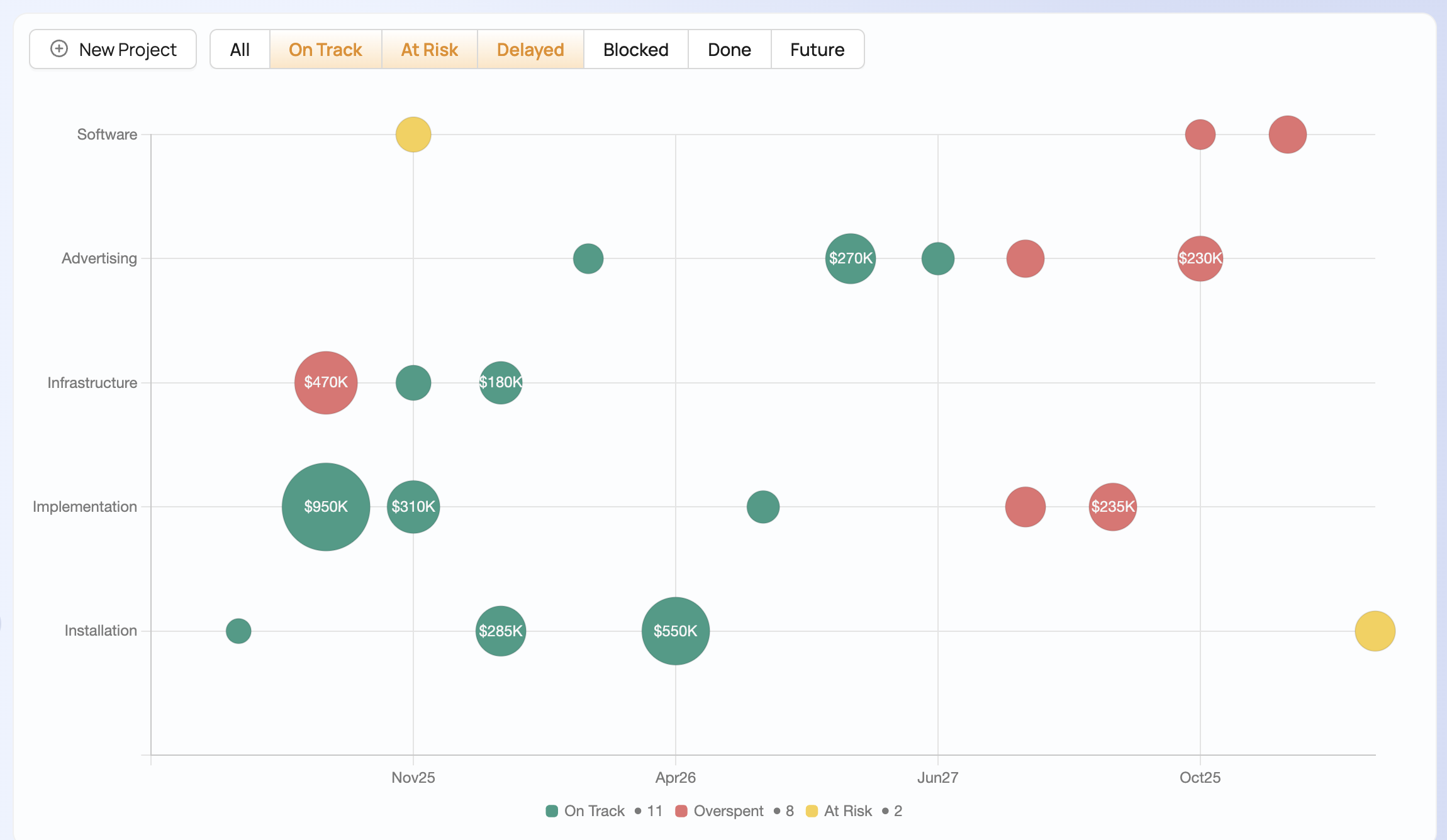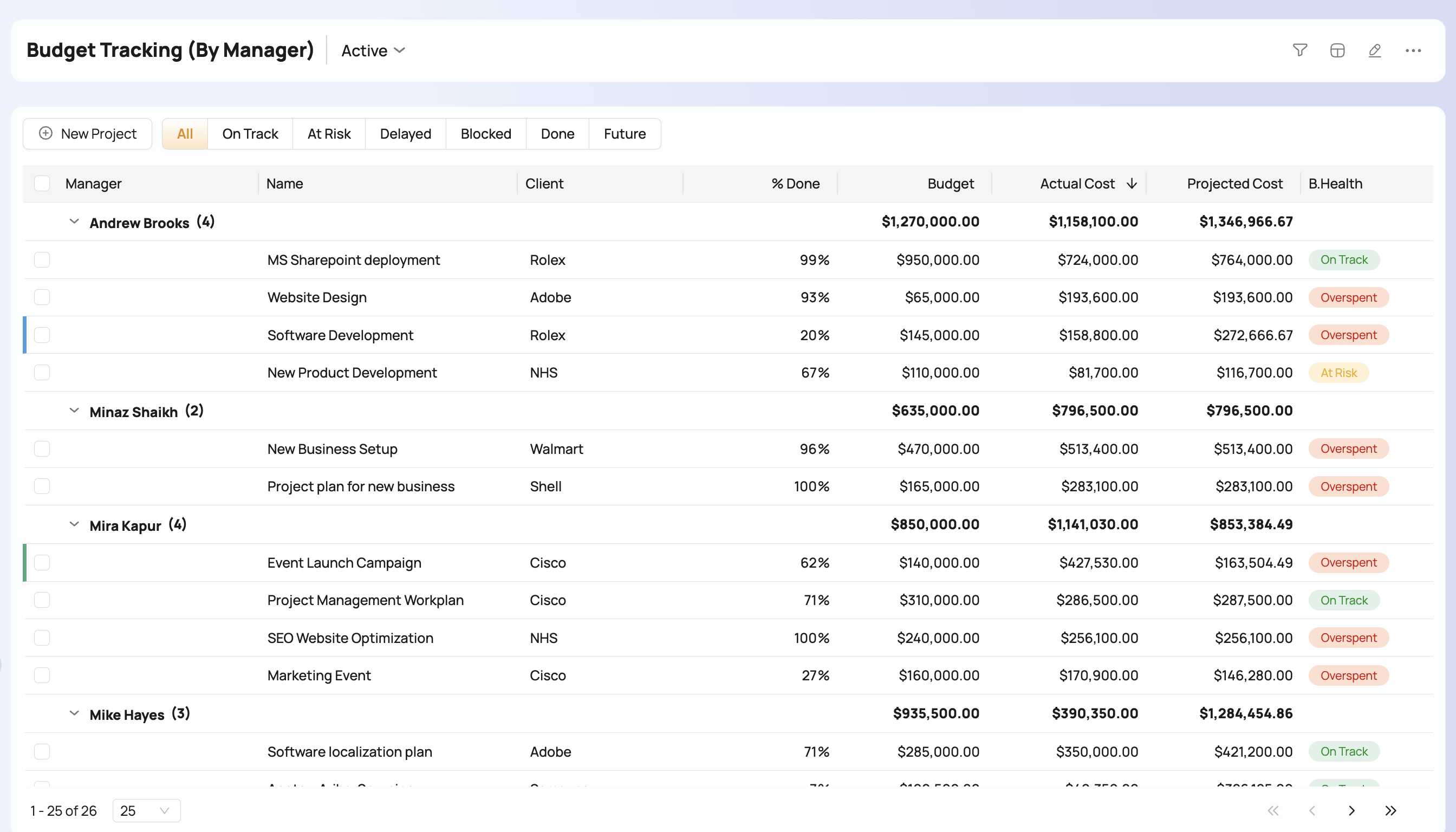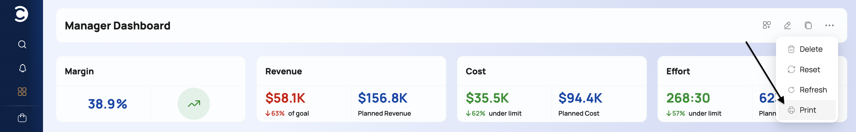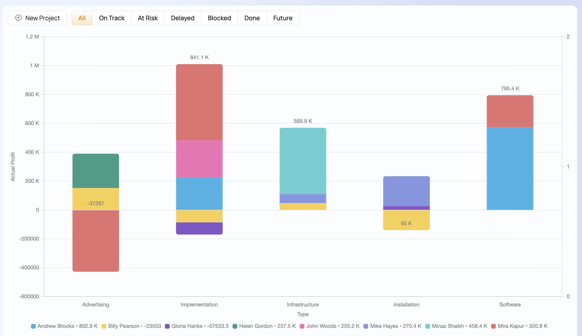 The Project Manager dashboard is a great place to track projects. You can customize the columns in list widgets, add chart widgets and drill-down into problem areas quickly. See the dashboards section of this document for more information.