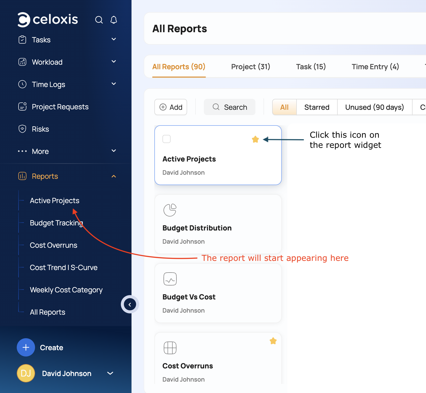 In the above example, clicking on the star for the report X makes it available in the Reports menu.