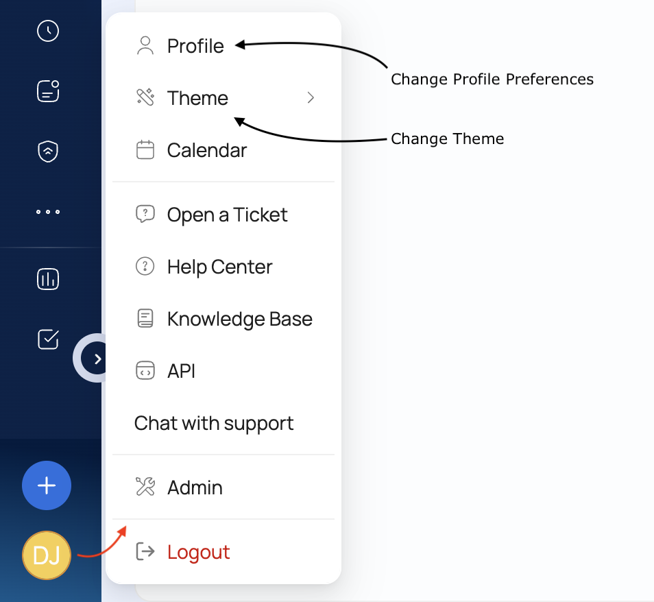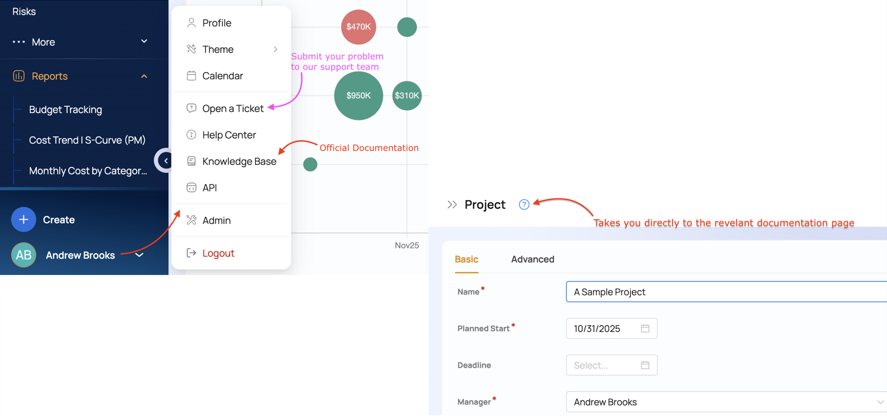 To ask our support team a question or to go to the documentation portal, click on the appropriate items in Top Menu ▸ .