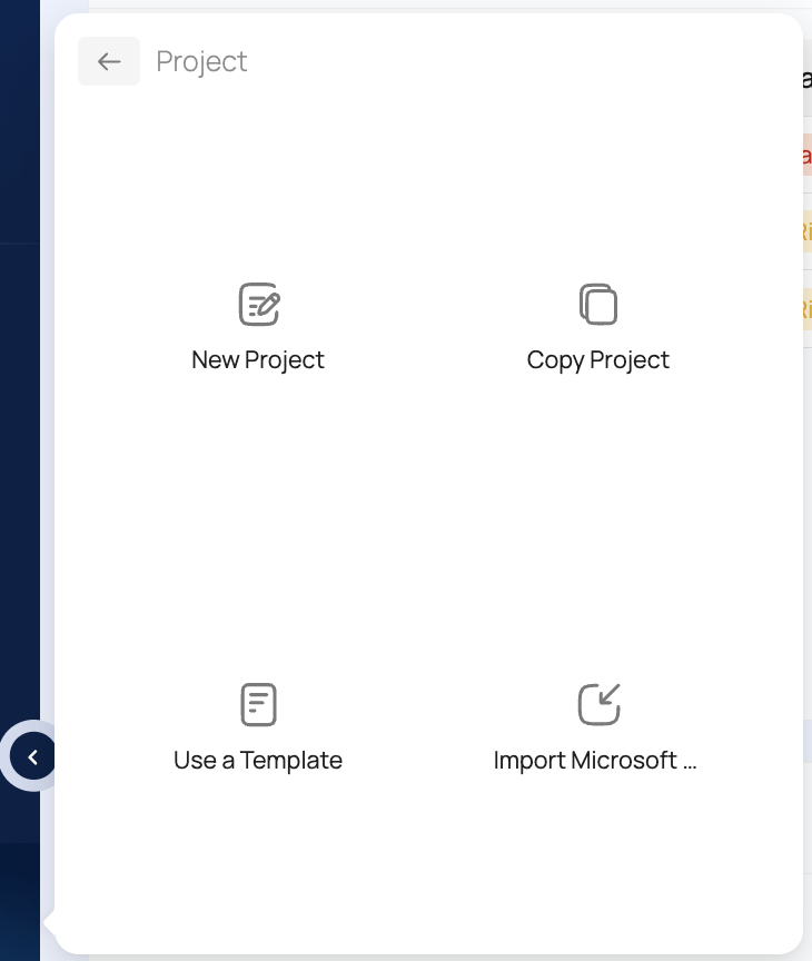 Click on Top Menu ▸ ▸ Project to add a project. You will be presented with a few options as shown below. If you have Microsoft Project files, you can import those or you can start with a blank project.