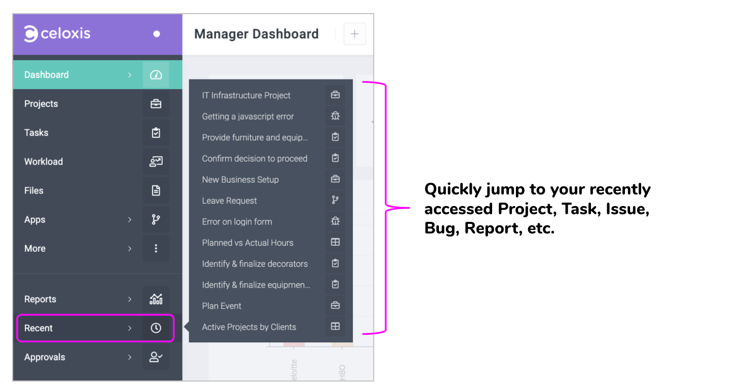 This menu is a great time saver. It lets you quickly jump to your recently accessed Project, Task, Issue, Bug, Report, etc.