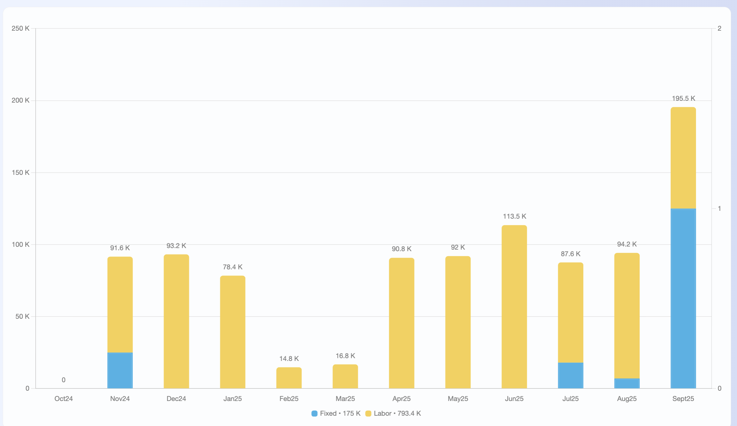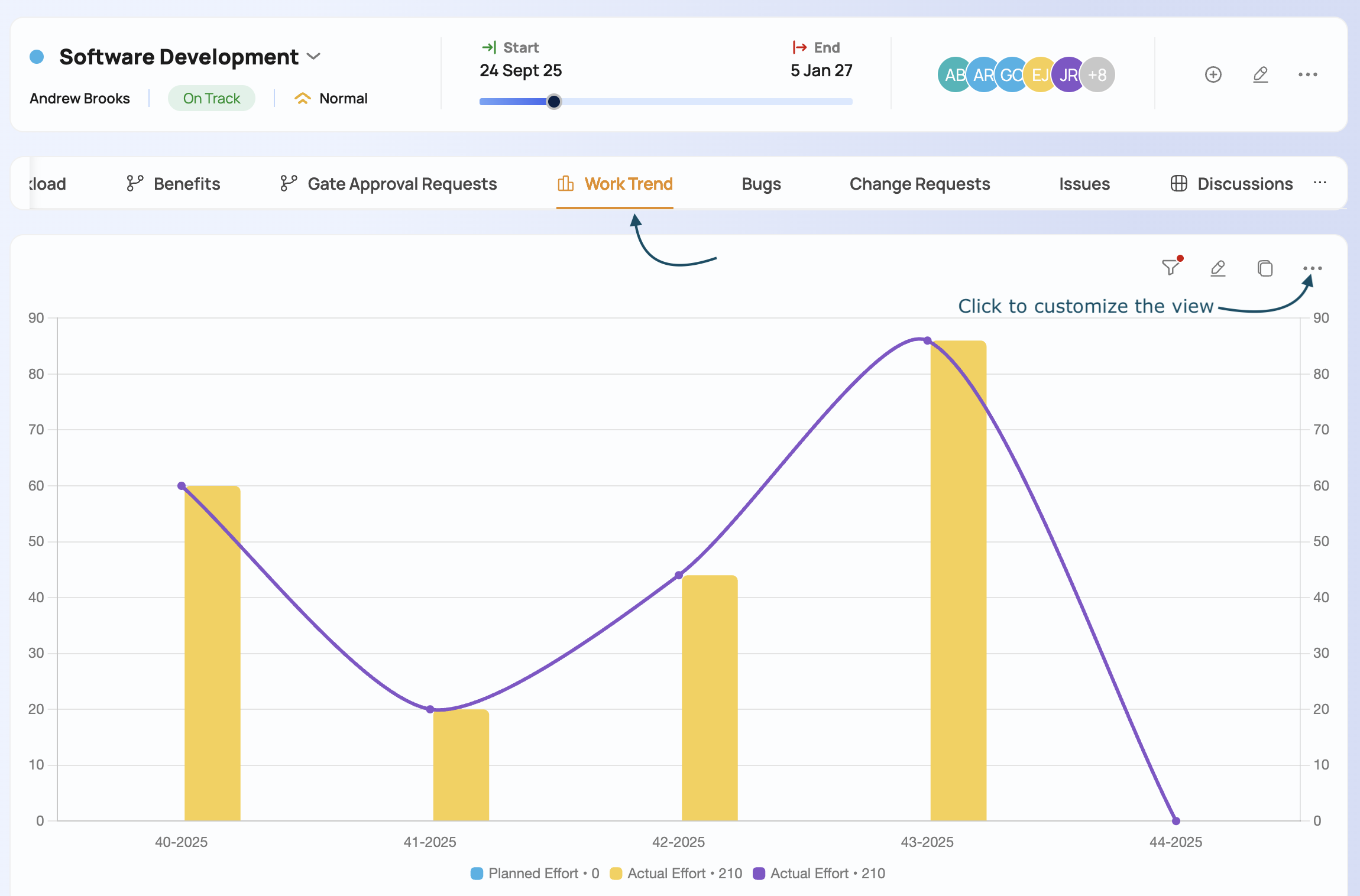 You can also click on the various tabs to get various reports for a project. A sample is shown below. All tabs are fully customizable and you can add, customize or delete tabs as per your requirements.