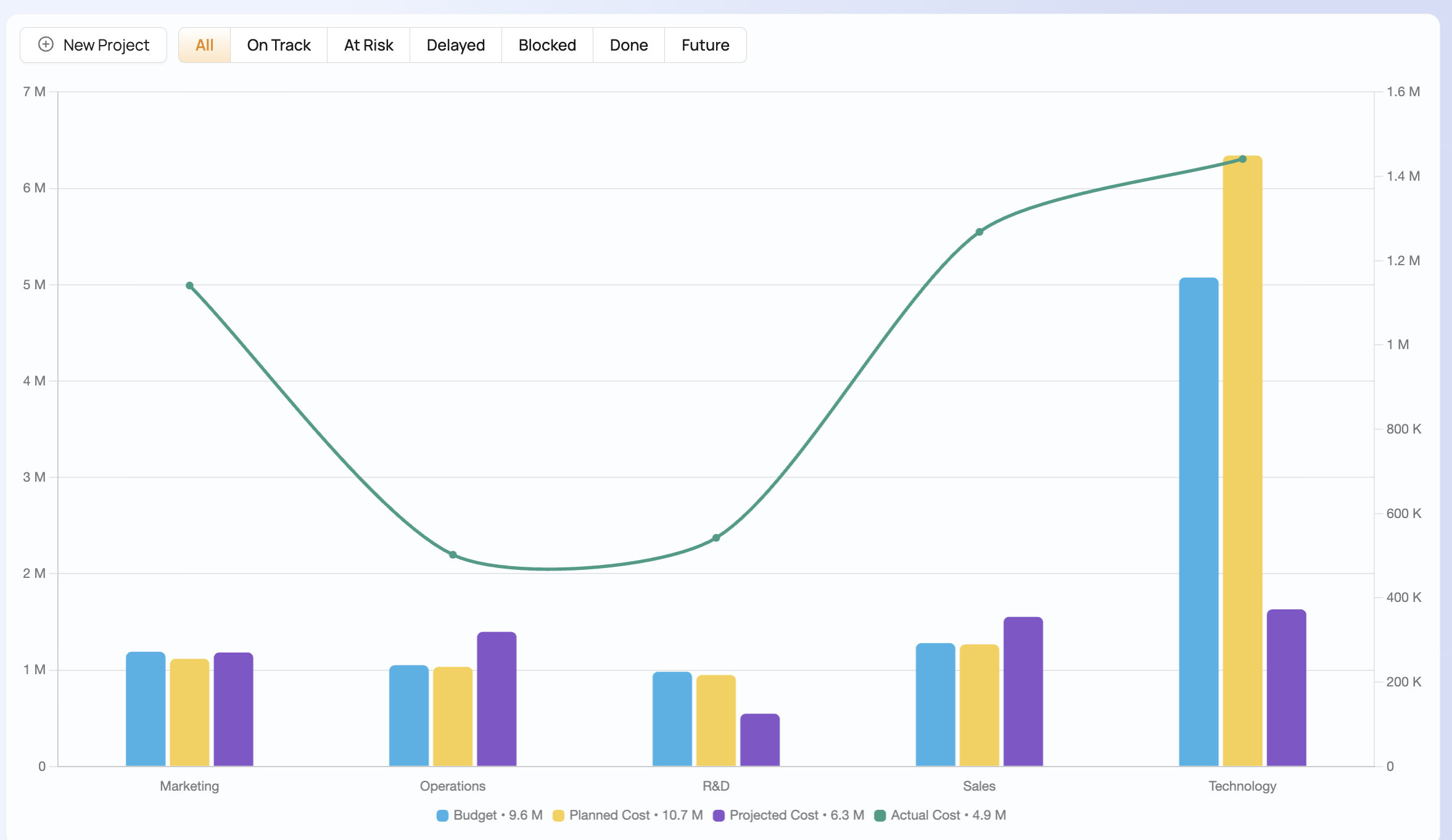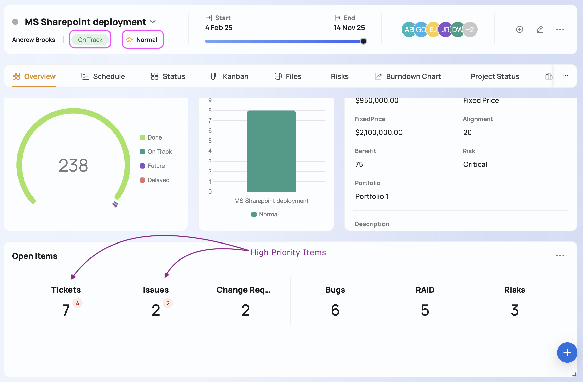 When you click on a project, a panel will open. This panel will have a lot of interesting tracking information about the schedule, cost, revenue and even identify high priority items in issues, change requests etc.