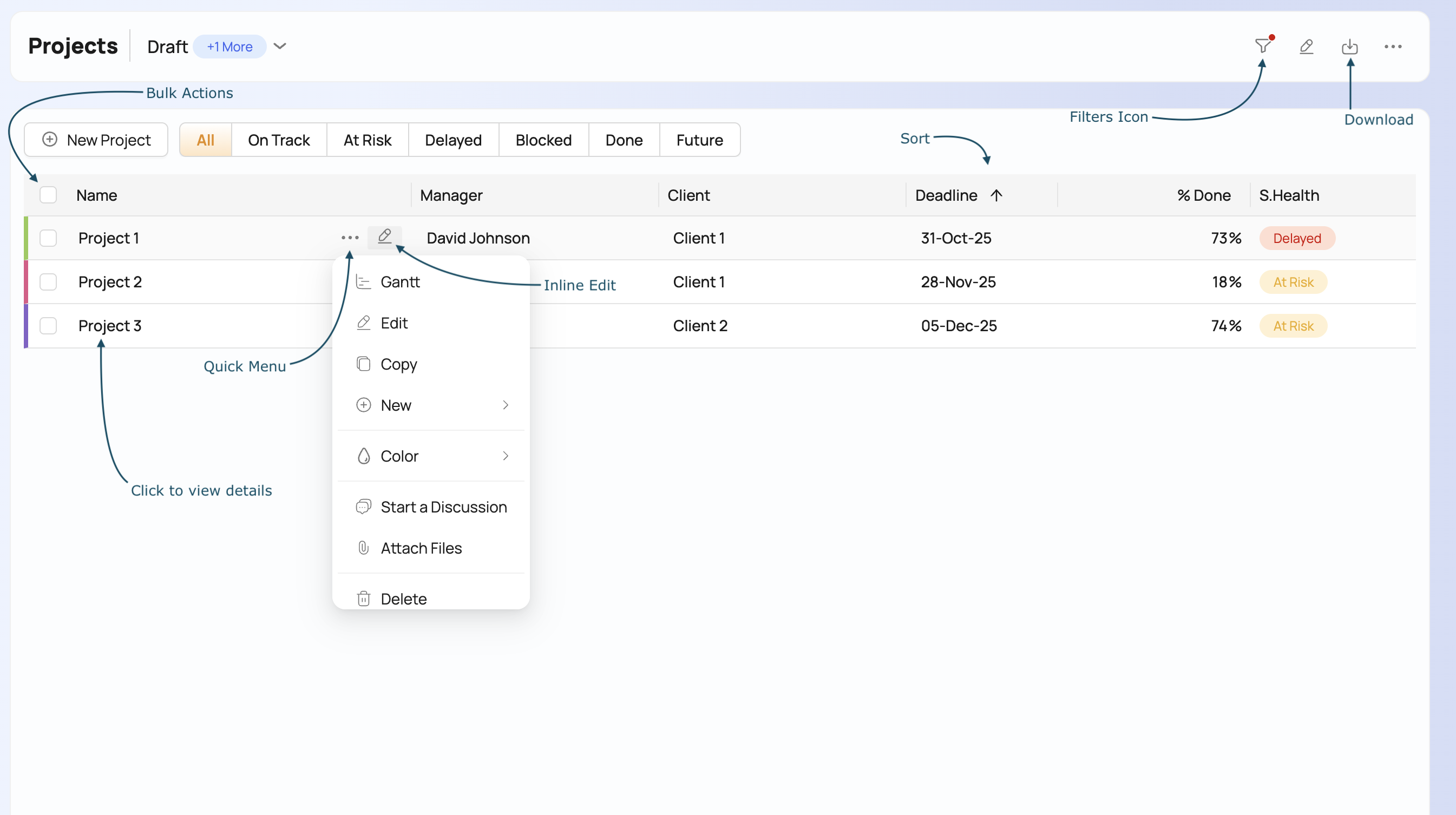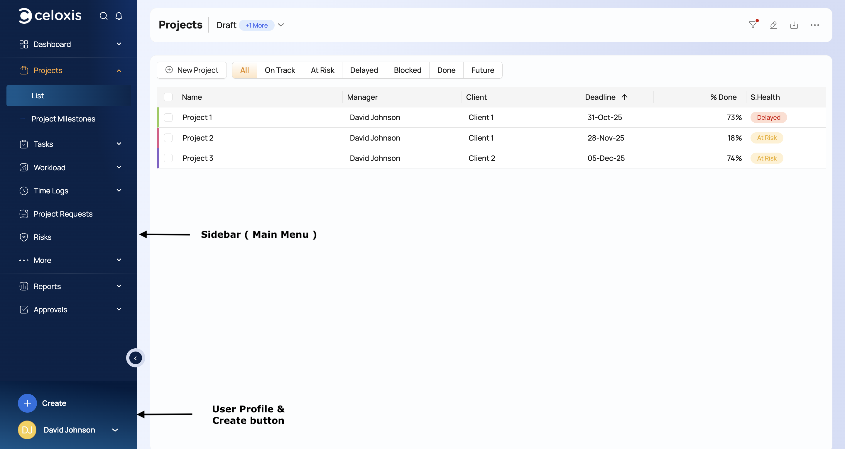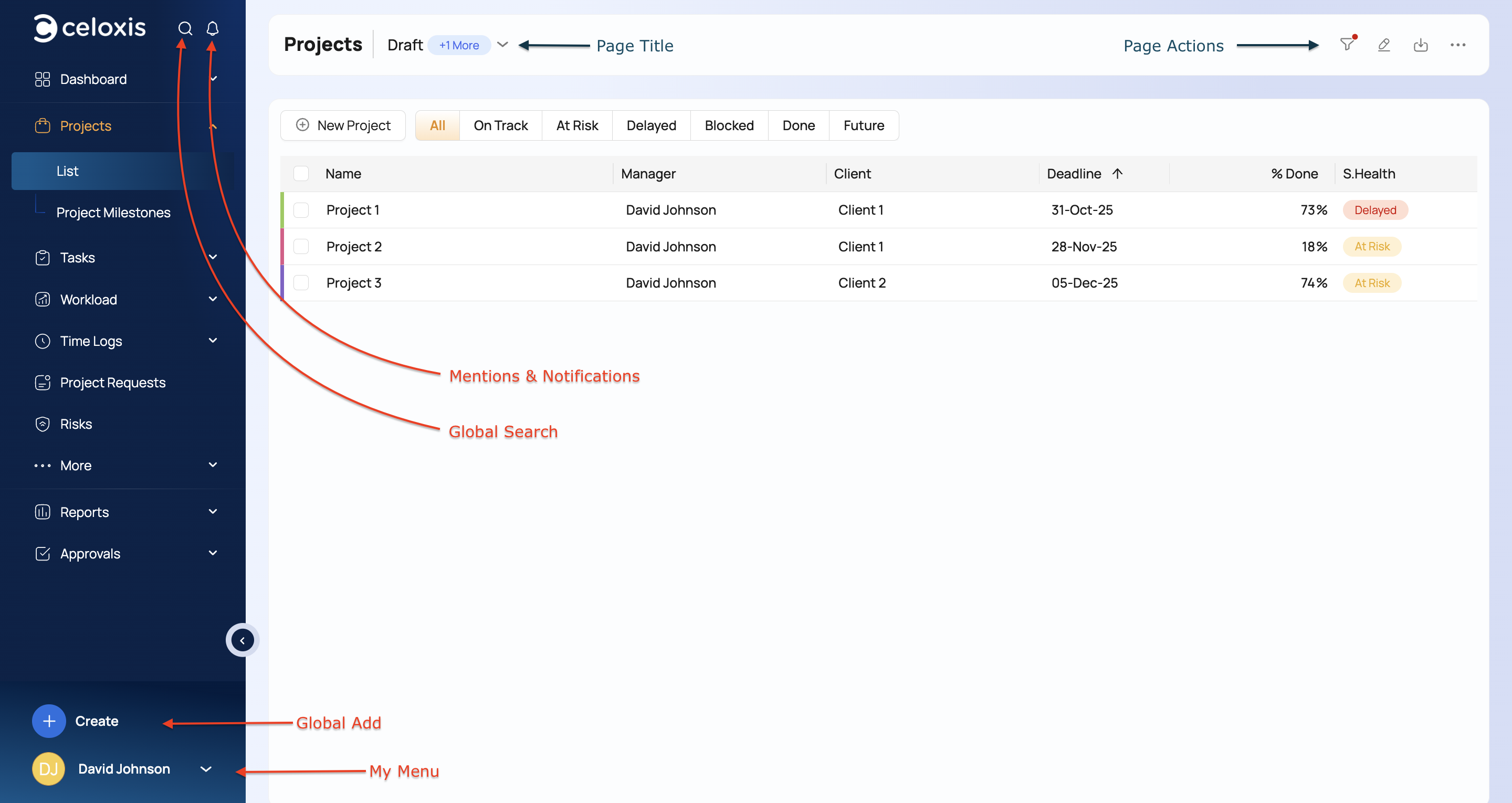 The Celoxis User Interface (UI) is consistent and predictable. This means that if you understand how one page works, you will understand how 90% of other pages work.