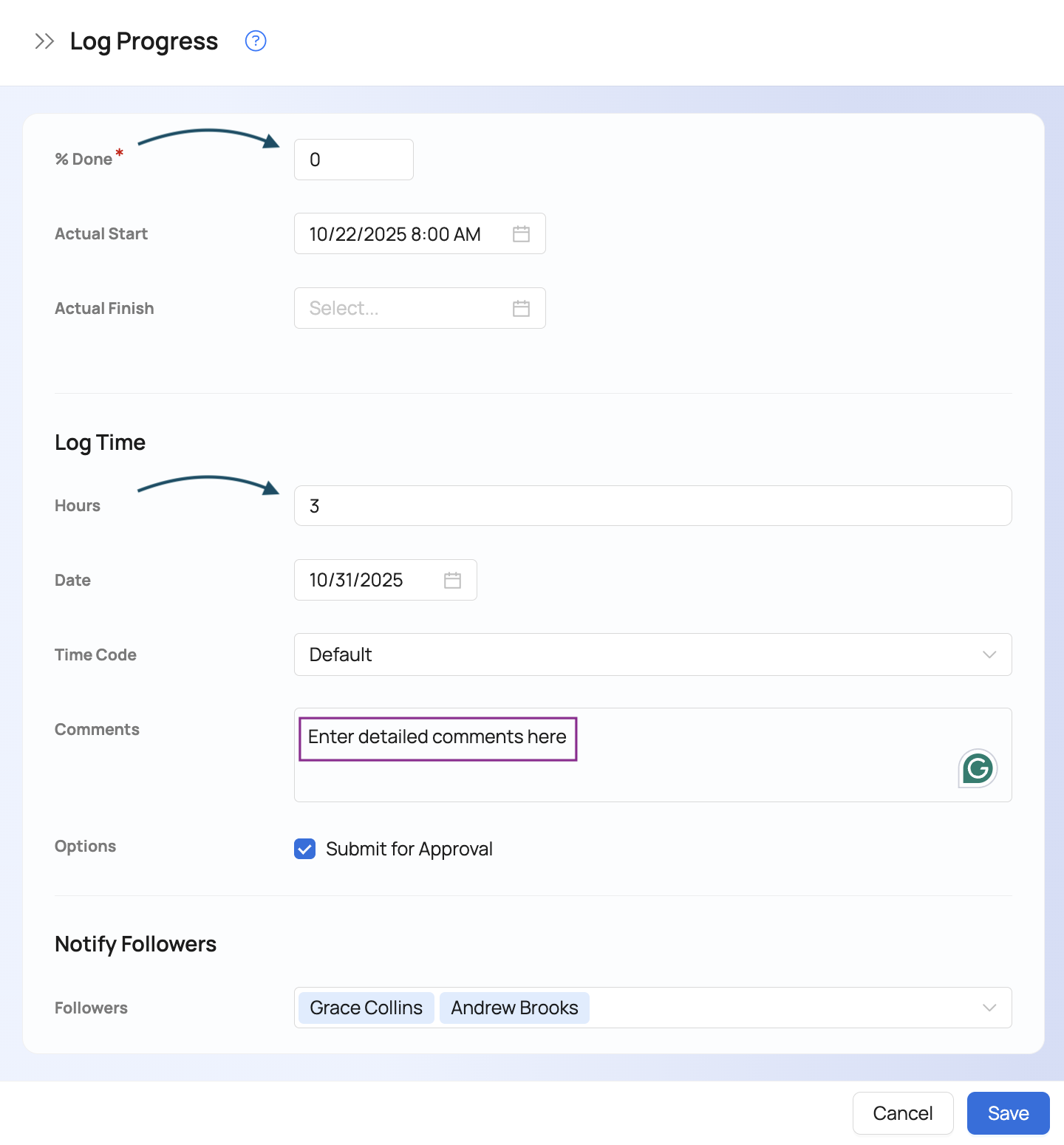 You can enter a detailed update and even log time at the same time using the action as shown below.