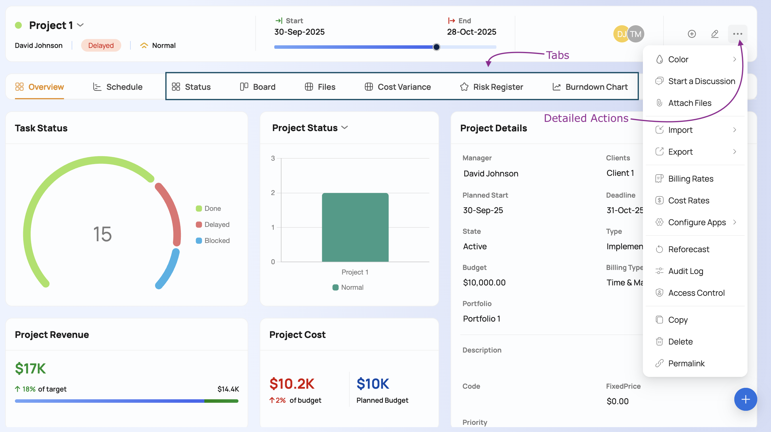 The panels have tabs so you can quickly view associated items like tasks, files, risks and even reports. Clicking on the icon will reveal a comprehensive action menu like shown below. Panels for tasks, issues etc are organized similarly.