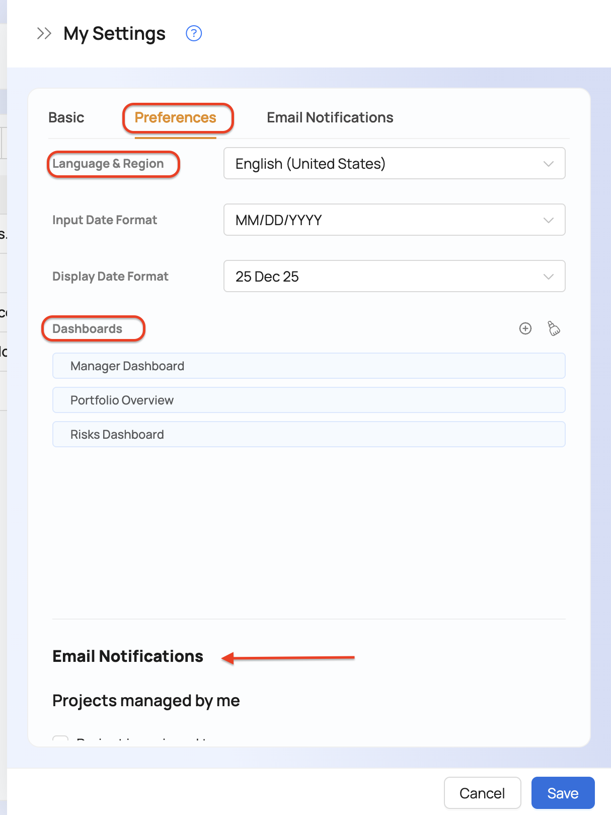 Click on the tab to change your language, date formats, email notification options and other preferences.