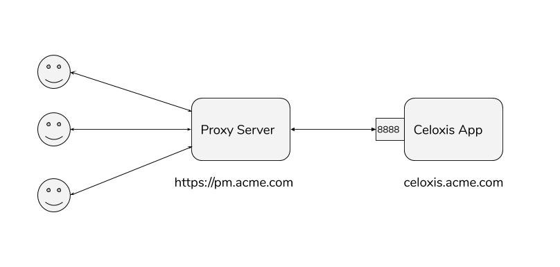 You may want to configure Celoxis application behind a reverse proxy server to provide SSL access to Celoxis. Let us assume we want to setup Acme consulting (acme.com) with the following configuration: