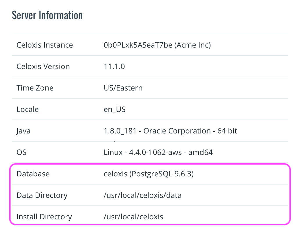 To find your install directory, database and data directory, navigate to Top Menu ▸ ▸ Admin ▸ Site Settings and check the Server Information as shown below:
