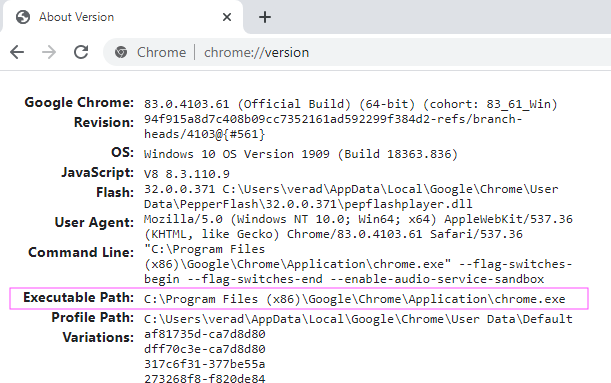 - Type chrome://version and press enter in the location bar. You should see something like the following image: