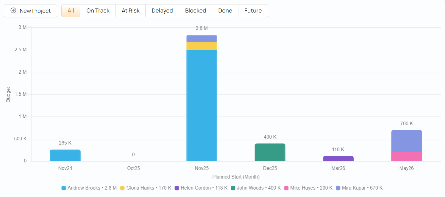 Below are just few examples of the helpful and easy-to-generate reports which can additionally inform you about budget allocations, actual costs and other financial aspects across multiple projects. Each report can be easily configured, grouped, ordered or turned to a visual chart to your liking.