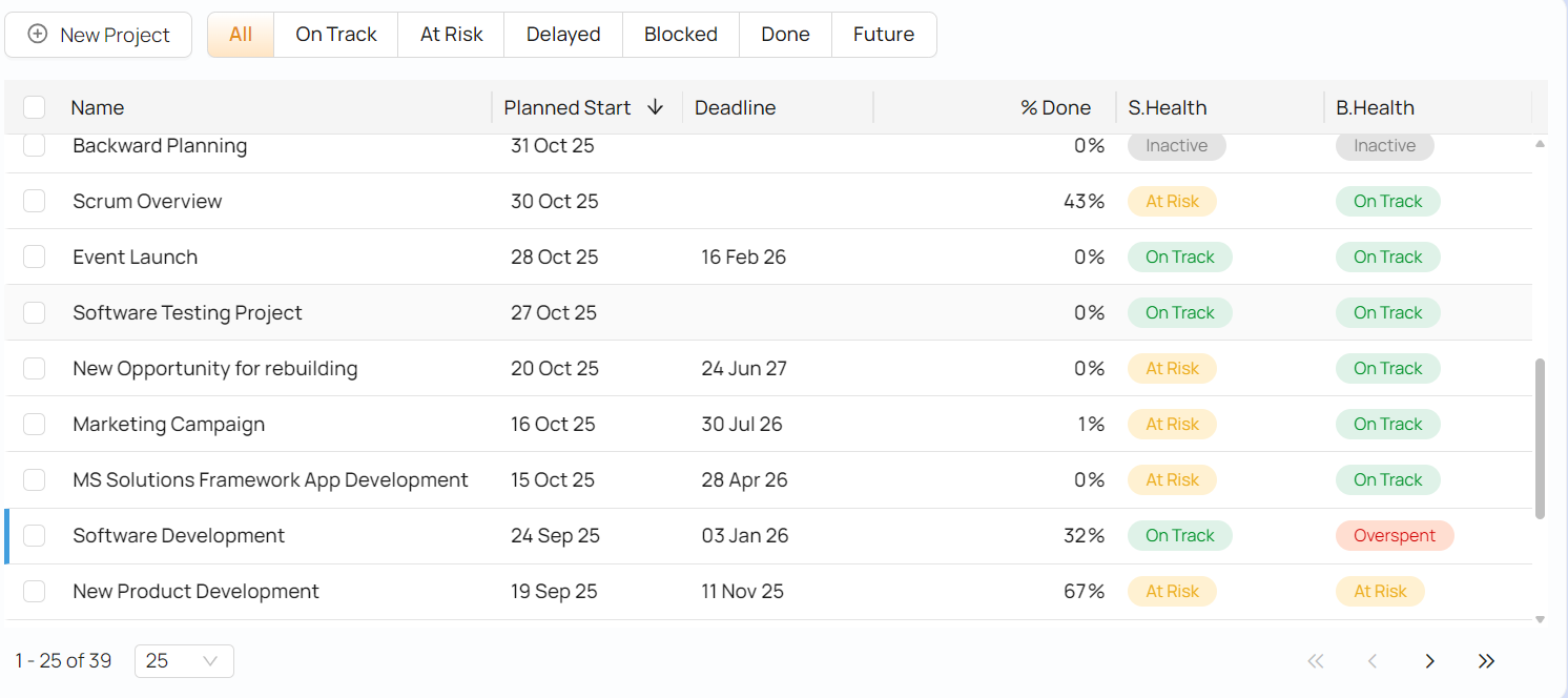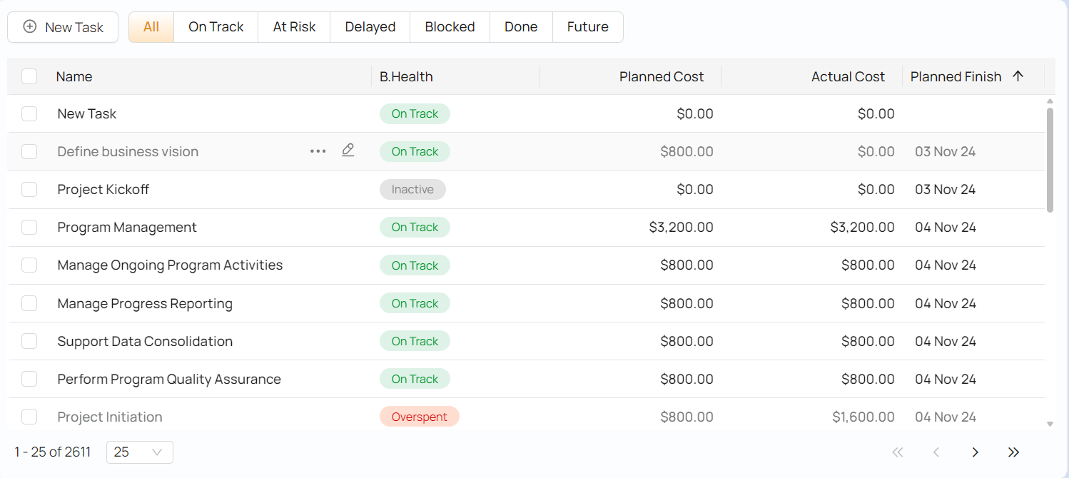 This makes it easy to track the budget status for each task individually. However, in most cases you are likely to be more concerned about the overall health of the project. This information is always conveniently displayed next to the project name.