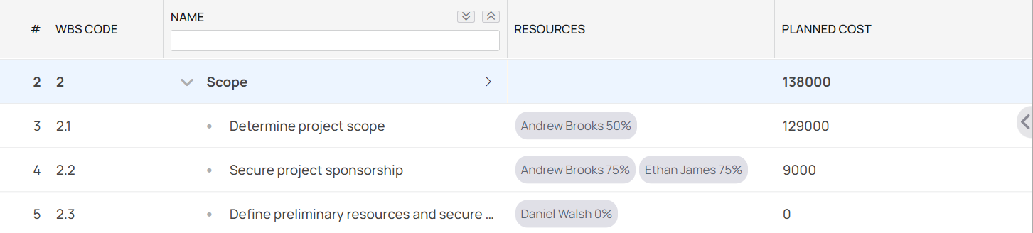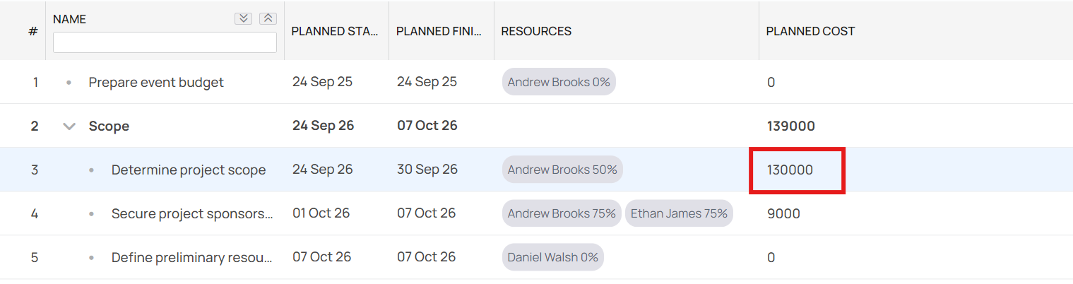 Updated Estimated Cost in the Gantt ChartOnce you complete this activity for all tasks in your plan, the total sum of Planned Costs of all the tasks will be the Planned Cost for the project. You will use the Planned Cost as a base for the budget of your project.