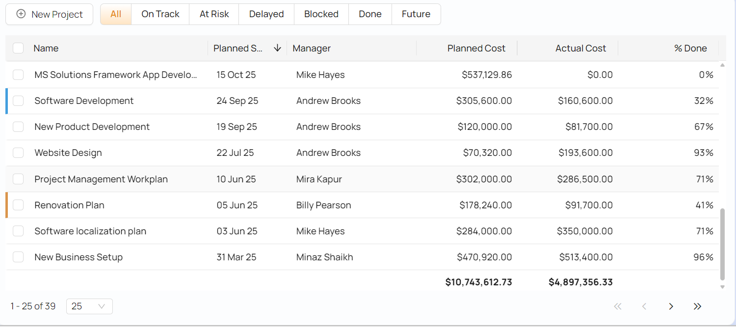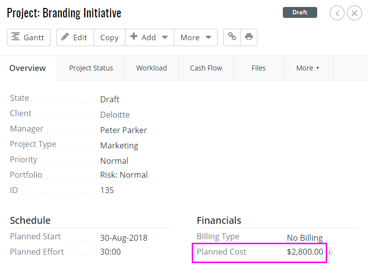 To see the project’s Planned cost, turn to the Financials section of the Project Details tab.