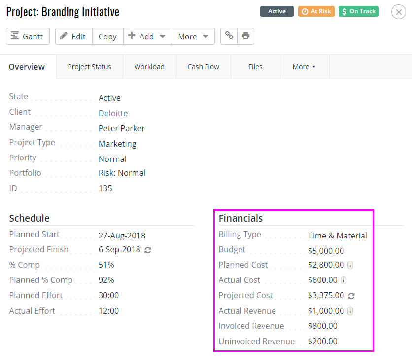 Project health indicatorsFor the basic metrics of the Project’s financials, turn to the Financials section of the Project’s Detail tab.
