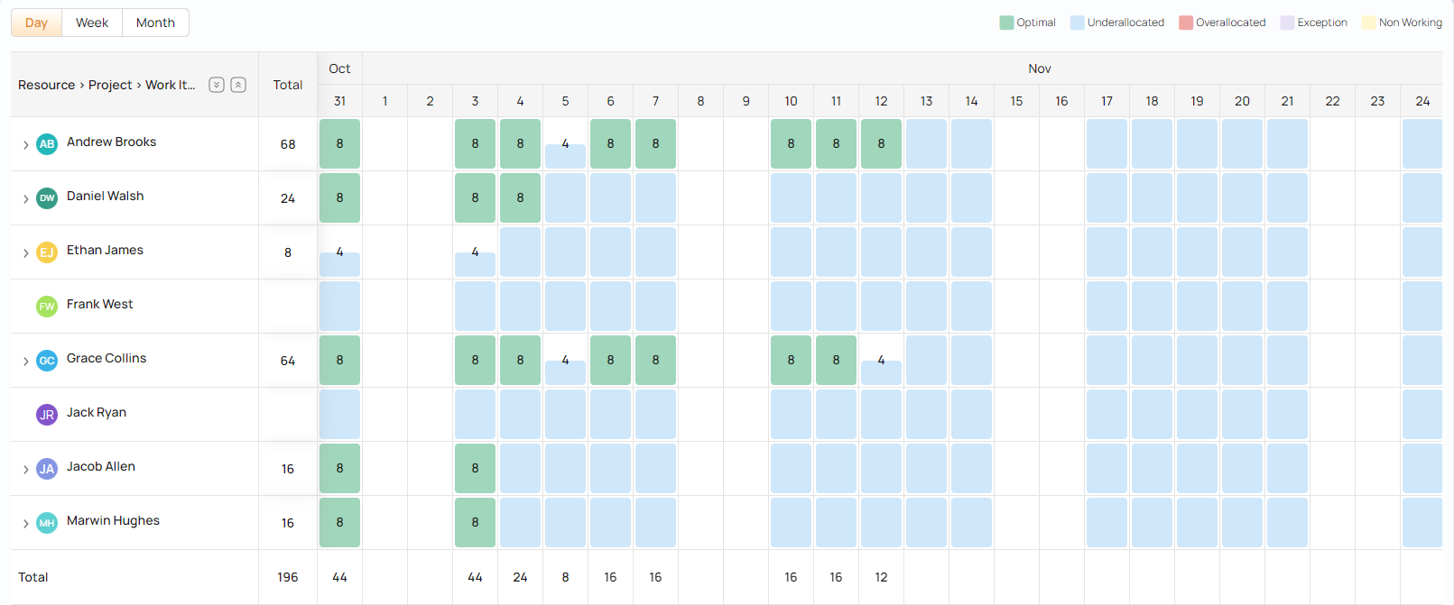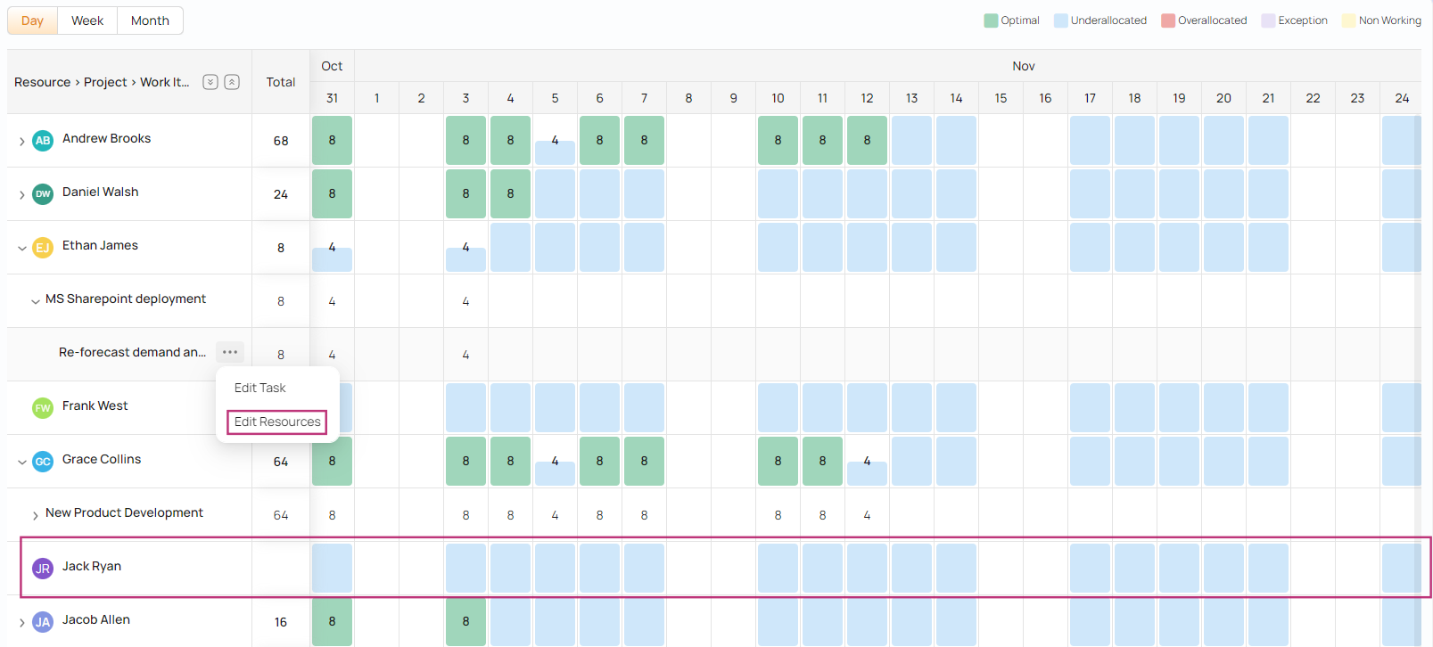 From the same Resource Load View, you can easily identify the under-utilized or free resources. These are the resources that are color-coded as blue.