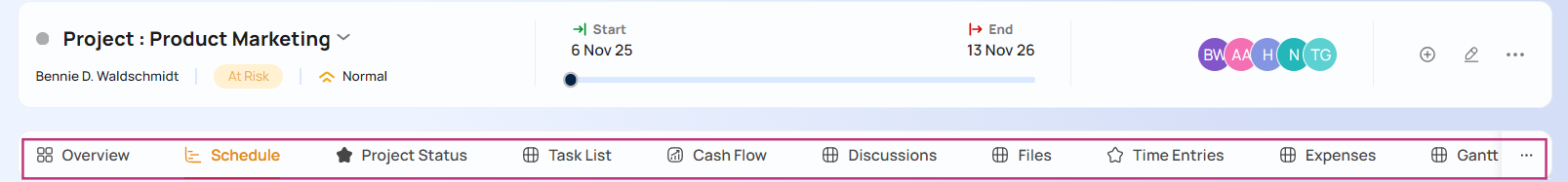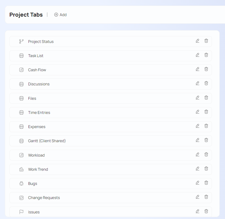 Your account comes with some default tabs but your administrator can customize them to suit your organization. Open Top Menu ▸ ▸ Admin ▸ ▸ Project Views and you can add, edit, delete, and reorder the reports. A sample of the project views management screen is show below. Note now the order of the reports corresponds to the order of the project tabs.