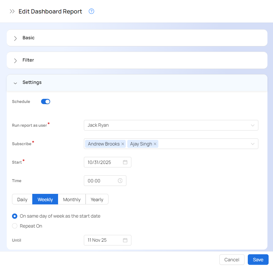 In the above example, the report will be run with the running user as Megan every Monday (since 06th May 2019 is a Monday) at 1:00 AM and the resulting PDF will be emailed to Weyland and Yutani.