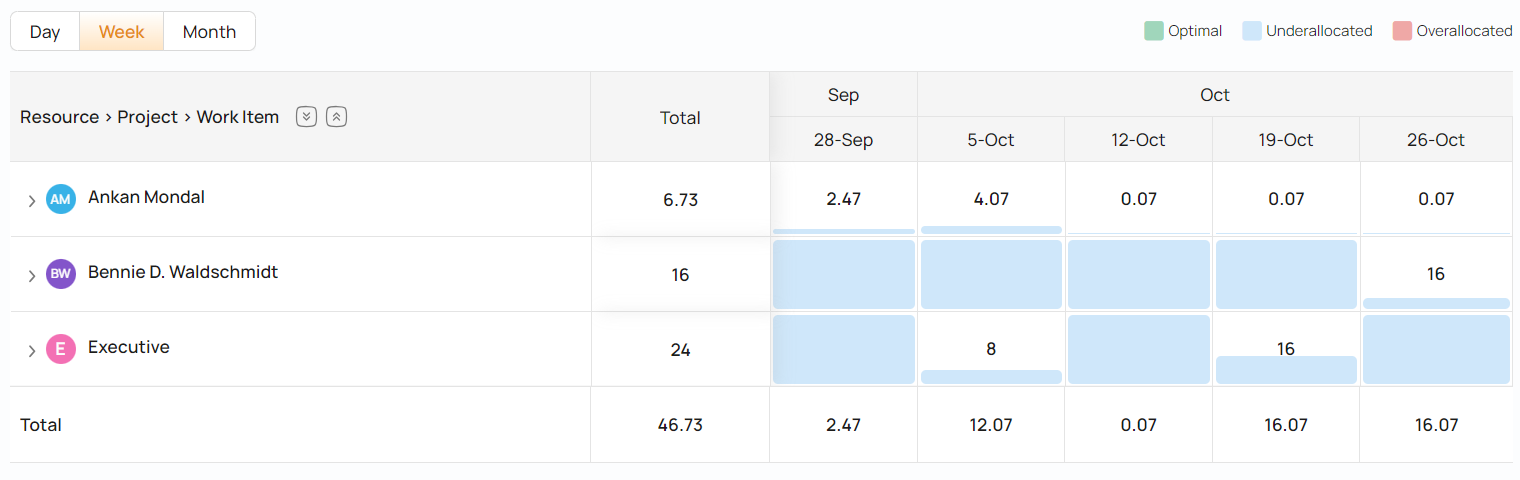 | Free Hours (Realtime) | Shows free hours assuming remaining hours for a task is distributed as per allocation from the present date. Remaining hours for a resource is Planned Effort - Actual Effort |
