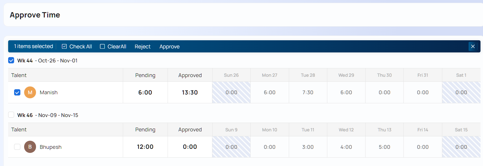 The above example shows time-entries submitted by Tanya and Joe Cool. You can check the boxes besides the users and then click Approve to approve all time-entries in one click OR click Timesheet to open Timesheet view to see the individual time-entries before approving.